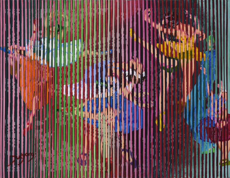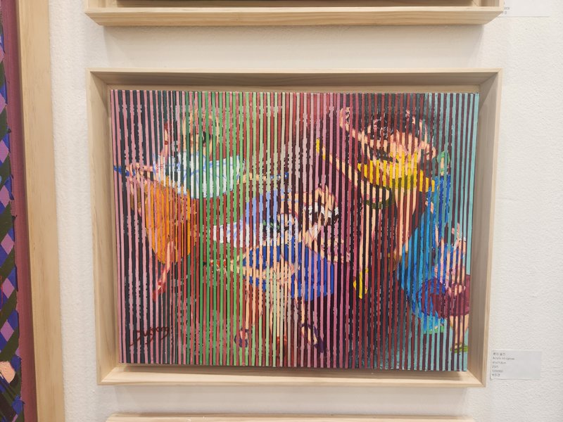 작가는 독창적인 회화 기법을 이용해 군중의 다양한 모습을 효과적으로 드러내고자 합니다. 먼저 작가의 작품에 드러난 인물들은 대부분 강렬한 원색으로 그려져 있고, 배경이나 다른 인물들과 보색대비를 이루고 있어 강렬한 느낌을 선사합니다. 이는 도시인들의 내면에 담긴 욕망과 겉으로 보이는 에너지 넘치는 삶의 대비를 보여줍니다. 패브릭 콜라주라는 생소하고 신선한 기법을 사용한 작품은 옷이라는 소재를 통해 패션에 담긴 현대 도시인들의 욕망과 개성을 적나라하게 드러내고 있기도 합니다. 또한 화면의 선 분할을 이용해 한 화면 안에 여러 이미지를 구성하고, 다른 장면이 겹쳐 보이게 하여 역동적이고 감각적인 느낌을 더해주고 있습니다. 눈길을 사로잡는 강렬한 색채와 현대적인 감각을 겸비한 작품을 원하신다면 이 작품과 함께하세요.