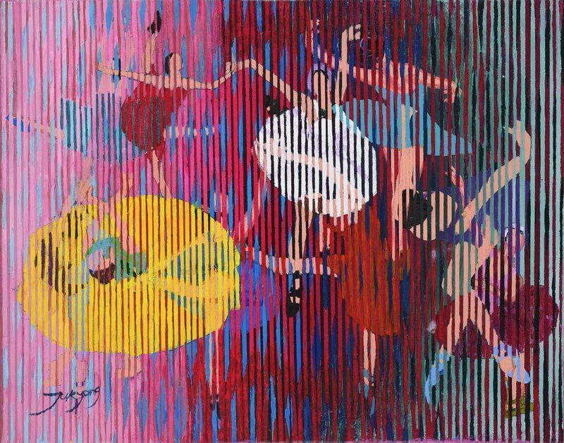 작가는 독창적인 회화 기법을 이용해 군중의 다양한 모습을 효과적으로 드러내고자 합니다. 먼저 작가의 작품에 드러난 인물들은 대부분 강렬한 원색으로 그려져 있고, 배경이나 다른 인물들과 보색대비를 이루고 있어 강렬한 느낌을 선사합니다. 이는 도시인들의 내면에 담긴 욕망과 겉으로 보이는 에너지 넘치는 삶의 대비를 보여줍니다. 패브릭 콜라주라는 생소하고 신선한 기법을 사용한 작품은 옷이라는 소재를 통해 패션에 담긴 현대 도시인들의 욕망과 개성을 적나라하게 드러내고 있기도 합니다. 또한 화면의 선 분할을 이용해 한 화면 안에 여러 이미지를 구성하고, 다른 장면이 겹쳐 보이게 하여 역동적이고 감각적인 느낌을 더해주고 있습니다. 눈길을 사로잡는 강렬한 색채와 현대적인 감각을 겸비한 작품을 원하신다면 이 작품과 함께하세요.