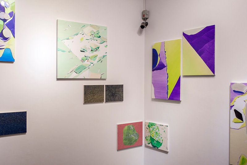 아담한 크기의 캔버스, 흩날리는 조각들의 표현은 강렬한 느낌을 자아냅니다. 어떤 작품에서 색면들의 구성은 어떤 질서를 따르고 있는 것처럼 보이기도 하지만, 다른 작품들에서는 그것을 찾아보기 어렵기도 합니다. 사실, 질서를 따르는 것처럼 보이는 작품에서도 작품이 따르고 있는 질서가 무엇인지가 헷갈리기도 합니다. 예를 들어서 어떤 작품들에서 색 면들은 식물과 화분을 구성하는 것처럼 보이지만, 이 색 면들도 마찬가지로 가벼운 터치로 그려졌다는 점에서 흘러내리거나 흩뿌려져 있는 듯한 느낌을 만들어냅니다. 또 다른 작품들은 뭉친 물감들이나 붓이 지나가면서 만들어낸 일직선의 자국들이 빠른 붓 터치가 이루어졌다는 점을 보여주죠. 작가는 이런 흔적들을 통해서 의미를 갖지 못하고 떠도는 미물들에 대한 주의를 환기시키고 그것들이 만들어내는 경쾌한 리듬에 참여하게 이끕니다. 김은주 작가의 작품과 함께 우리 주변의 가벼운 것들의 흐름을 느껴보는 시간을 가져보시기 바랍니다.