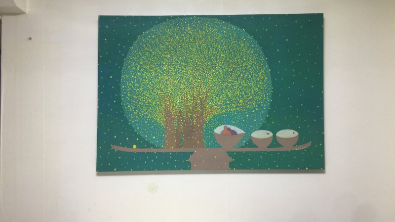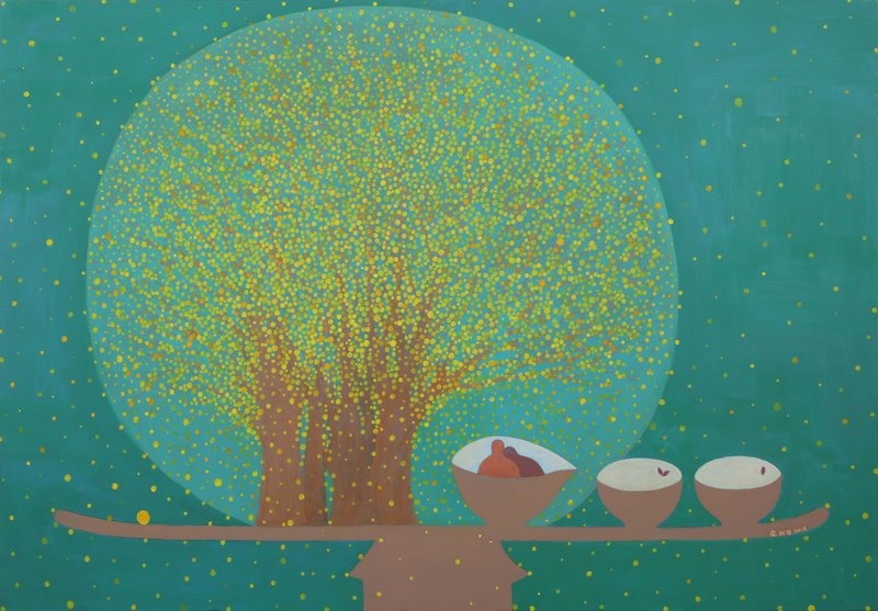 숟가락과 젓가락 한 쌍을 가지런히 놓은 밥상은 하루에 세 번씩도 접할 수 있는 흔한 풍경이다. 가마솥, 밥그릇, 반찬, 등의 밥상이랑 관련된 사물들과 배경에는 단순한 패턴을 조합한 작품은 한 끼의 식사처럼 정감이 느껴진다. 별이 밝게 빛나는 밤처럼 보이기도 하고 날씨가 화창한 한여름 날씨처럼 작품의 배경을 관찰하다 보면 간결한 표현 속에 작가가 보여주고자 한 날씨, 시간, 계절 등이 담겨 있어 미소를 자아낸다. 따스한 색감이 더해져 감상할수록 기분 또한 밝아지게 만드는 작품으로 쉽게 지나칠 수 있는 사소한 일상의 모습을 어머니의 손길이 닿은 듯 정겹게 표현한 것이 인상적이다.