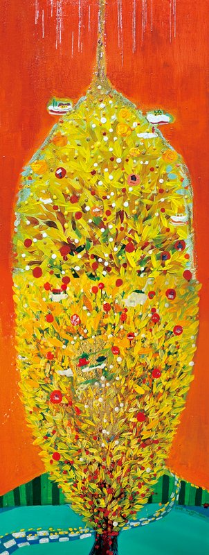 초현실적인 작품의 분위기처럼 김지선 작가의 작품에는 우리의 일반적인 상식으로는 함께 있음이 어울리지 않는 혹은 어색한 관계들이 모여 하나의 작품을 이룹니다. 코뿔소, 낙타, 무성하게 우거진 수풀과 인류 문명의 발달을 상징하는 초고층 빌딩 숲까지. 김지선 작가의 작품에는 현실과 거리가 먼 상상의 세계가 펼쳐집니다. 아이들의 동심을 자극하기도 하는 그의 작품은 우리가 상식적으로 인지하는 자연, 도시를 새로운 관점으로 볼 수 있게 합니다. 독특한 작품세계는 어린 시절 자란 남해 풍경과 이국적 메시지에서 큰 영감을 받은 것입니다. 대도시의 활발함과 자연이 주는 평온함이 공존하는 그의 작품을 보고 있으면 따스한 행복을 느끼게 됩니다.