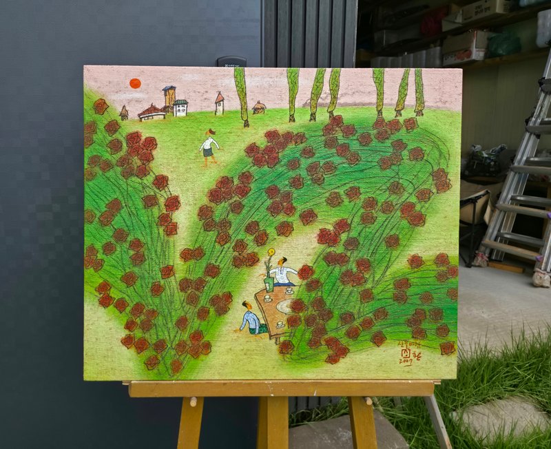 계절과 시간의 변화에 따라 제때 어울리는 옷을 입은 자연의 색이 먼저 마음을 끌어당깁니다. 그리고 그 안에서 맛있는 음식을 나누어 먹고, 달을 바라보며 무언가를 빌거나 떠올리기도 하고, 이웃 친구들과 자연을 놀이터 삼아 노니는 사람들은 향수를 자극합니다. 이 작품을 통해 유년 시절 고향을 떠올리는 이들도 있을 것이며, 누군가는 명절마다 방문하는 조부모님의 집을 떠올릴 수도 있으며, 하다못해 도시에서 나고 자란 이들은 부모님의 유년 시절을 상상할 수도 있을 것입니다. 생동하는 색과 선은 우리의, 우리 부모님들의 소중한 이야기를 생생하게 전달하고 간직하게 해줍니다.