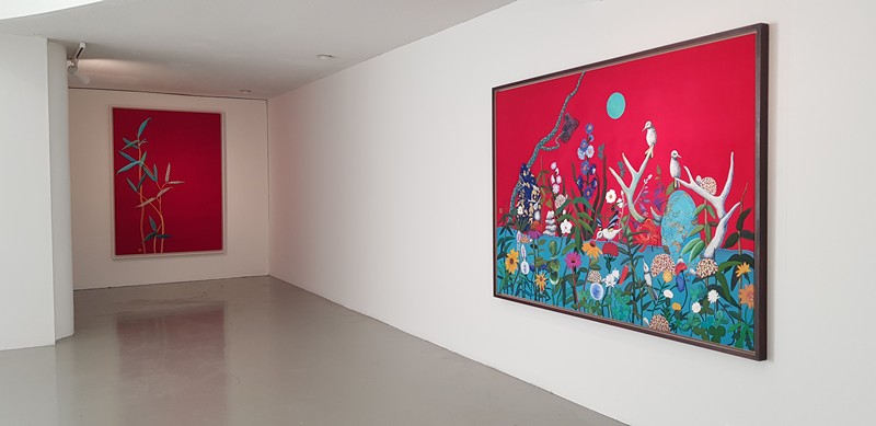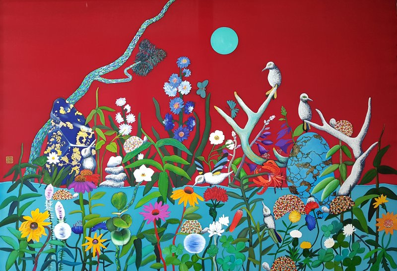 해, 달, 별, 학, 소나무 등의 소재들은 옛날부터 사람들이 무병장수를 기원하면서 다양한 생활용품들 속에 그려 넣었던 것입니다. 작가는 이러한 인간의 바람이 현재에도 이어진다는 점을 관찰하고, 전통적인 소재인 십장생을 현대적인 기법으로 풀어냅니다. 작가의 현대적인 ‘비틀기’는 십장생을 그려 넣는 방식에서도 관찰할 수 있습니다. 전통적인 십장생화에서는 모든 십장생의 온전한 모습을 담아내지만, 작가는 이 중 몇 개를 선택해서 묘사하며, 십장생이 가진 전형적인 색이나 묘사 방법도 다릅니다. 예를 들어서 전통적인 십장생화에서 해는 적색, 달은 황색을 띠지만, 작가의 작업에서 해는 적색 외의 여러 가지 색으로 나타납니다. 작가의 독특함은 작가가 캔버스로 비단을 선택하고 있다는 점에서도 엿볼 수 있습니다. 특히 비단 특유의 촉감을 살려냄으로써 자신만의 캔버스를 만들어낸다는 점에서 독특하죠. 김근정 작가의 작업과 함께 전통의 현대적인 변주가 어떻게 이루어지고 있는지 살펴보는 시간을 가져보셔도 좋을 것 같습니다.