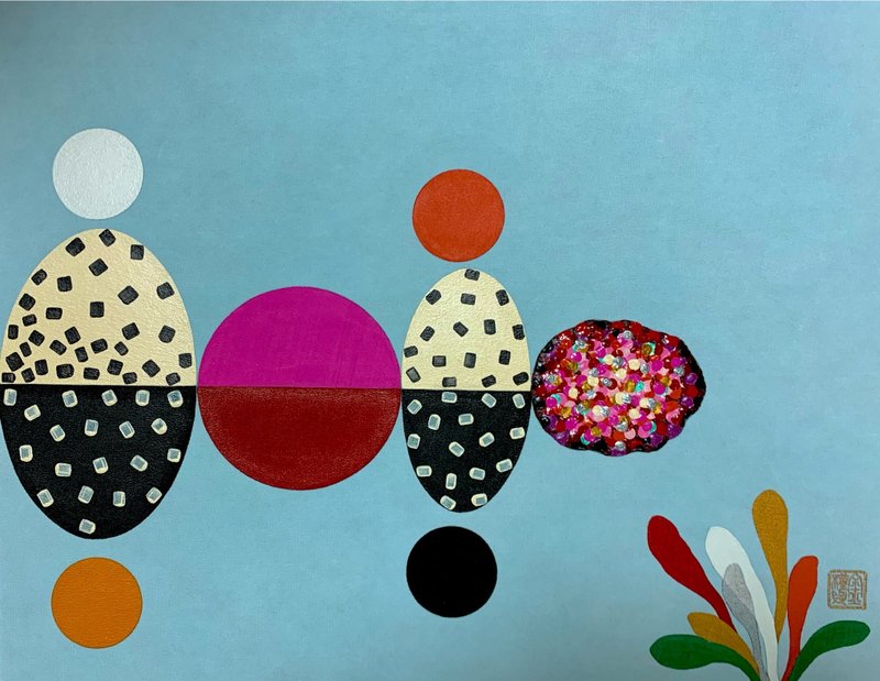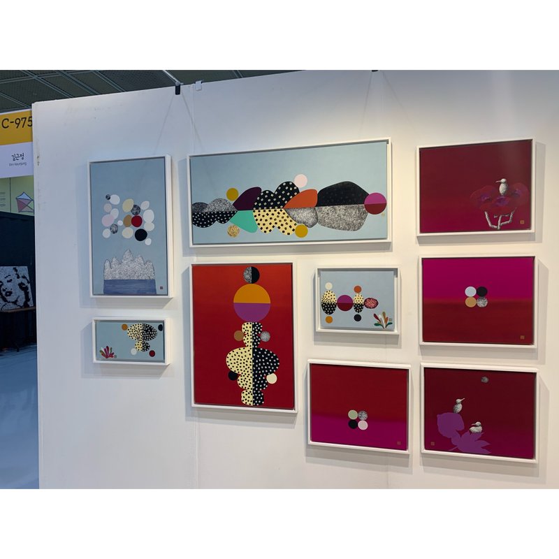 해, 달, 별, 학, 소나무 등의 소재들은 옛날부터 사람들이 무병장수를 기원하면서 다양한 생활용품들 속에 그려 넣었던 것입니다. 작가는 이러한 인간의 바람이 현재에도 이어진다는 점을 관찰하고, 전통적인 소재인 십장생을 현대적인 기법으로 풀어냅니다. 작가의 현대적인 ‘비틀기’는 십장생을 그려 넣는 방식에서도 관찰할 수 있습니다. 전통적인 십장생화에서는 모든 십장생의 온전한 모습을 담아내지만, 작가는 이 중 몇 개를 선택해서 묘사하며, 십장생이 가진 전형적인 색이나 묘사 방법도 다릅니다. 예를 들어서 전통적인 십장생화에서 해는 적색, 달은 황색을 띠지만, 작가의 작업에서 해는 적색 외의 여러 가지 색으로 나타납니다. 작가의 독특함은 작가가 캔버스로 비단을 선택하고 있다는 점에서도 엿볼 수 있습니다. 특히 비단 특유의 촉감을 살려냄으로써 자신만의 캔버스를 만들어낸다는 점에서 독특하죠. 김근정 작가의 작업과 함께 전통의 현대적인 변주가 어떻게 이루어지고 있는지 살펴보는 시간을 가져보셔도 좋을 것 같습니다.