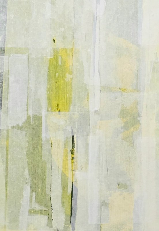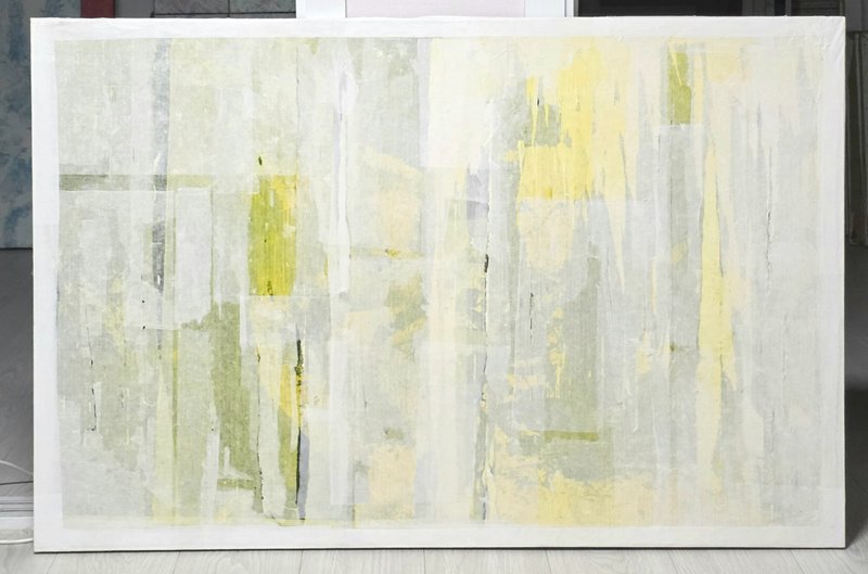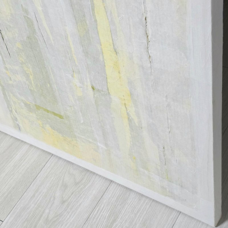 한지에서 느껴지는 은은함이나, 온화함, 자연스러움 등은 다른 매체에서 느낄 수 없는 고유한 시각적, 정서적 체험을 선사합니다. 또한 한국 현대미술에서 한지는 이제 한국적인 미감을 구현하는 것을 넘어 인간의 다양한 감정을 섬세하게 함축하고 드러내는 조형 도구로써 응용되고 있습니다. 김은미 작가의 작업도 한지를 붙이고 찢고 주름으로 표현하기도 하는 중첩의 기법으로 제작됩니다. 한지를 통해 화면 안에서 새로운 이미지를 생성하거나 그것들의 조합을 통해 내적 감성을 투명하게 쏟아내는 것이죠. 이렇게 작품 속 비구상의 서정적인 풍경은 구체적인 심상에 근거를 두지만, 작가는 이를 연상할 수 있는 최소한의 단서만을 남겨 감상자의 상상력을 유도합니다. 비로소 멈추었을 때 얻을 수 있는 사색의 시간을 이 작품과 함께 가져 보는 건 어떨까요?