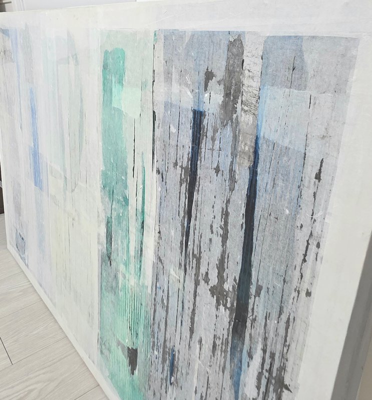 한지에서 느껴지는 은은함이나, 온화함, 자연스러움 등은 다른 매체에서 느낄 수 없는 고유한 시각적, 정서적 체험을 선사합니다. 또한 한국 현대미술에서 한지는 이제 한국적인 미감을 구현하는 것을 넘어 인간의 다양한 감정을 섬세하게 함축하고 드러내는 조형 도구로써 응용되고 있습니다. 김은미 작가의 작업도 한지를 붙이고 찢고 주름으로 표현하기도 하는 중첩의 기법으로 제작됩니다. 한지를 통해 화면 안에서 새로운 이미지를 생성하거나 그것들의 조합을 통해 내적 감성을 투명하게 쏟아내는 것이죠. 이렇게 작품 속 비구상의 서정적인 풍경은 구체적인 심상에 근거를 두지만, 작가는 이를 연상할 수 있는 최소한의 단서만을 남겨 감상자의 상상력을 유도합니다. 비로소 멈추었을 때 얻을 수 있는 사색의 시간을 이 작품과 함께 가져 보는 건 어떨까요?