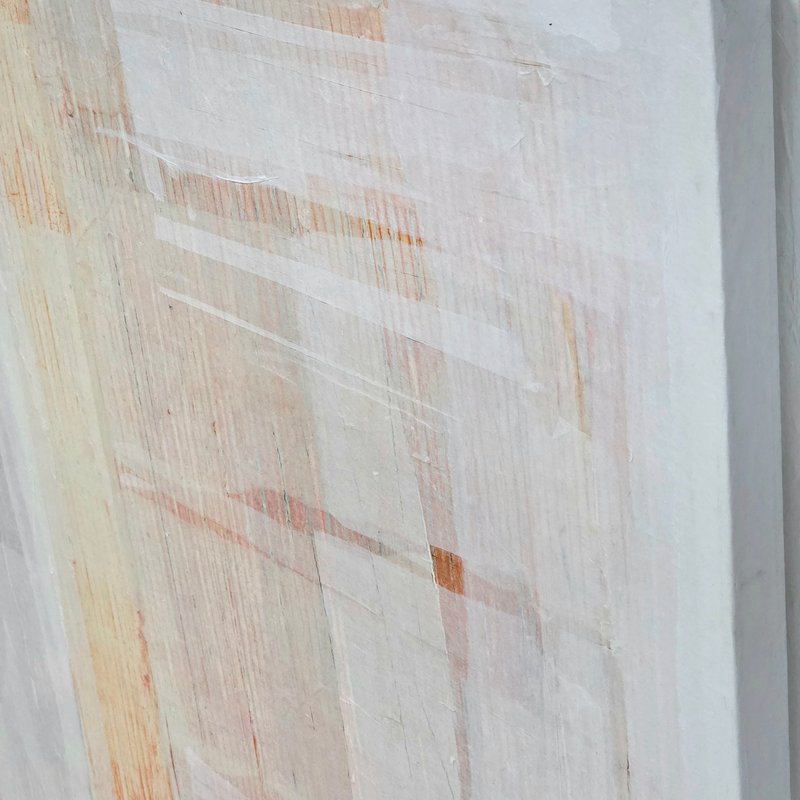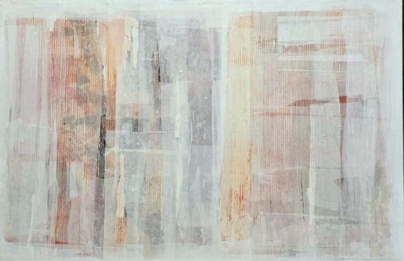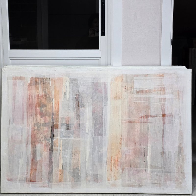 한지에서 느껴지는 은은함이나, 온화함, 자연스러움 등은 다른 매체에서 느낄 수 없는 고유한 시각적, 정서적 체험을 선사합니다. 또한 한국 현대미술에서 한지는 이제 한국적인 미감을 구현하는 것을 넘어 인간의 다양한 감정을 섬세하게 함축하고 드러내는 조형 도구로써 응용되고 있습니다. 김은미 작가의 작업도 한지를 붙이고 찢고 주름으로 표현하기도 하는 중첩의 기법으로 제작됩니다. 한지를 통해 화면 안에서 새로운 이미지를 생성하거나 그것들의 조합을 통해 내적 감성을 투명하게 쏟아내는 것이죠. 이렇게 작품 속 비구상의 서정적인 풍경은 구체적인 심상에 근거를 두지만, 작가는 이를 연상할 수 있는 최소한의 단서만을 남겨 감상자의 상상력을 유도합니다. 비로소 멈추었을 때 얻을 수 있는 사색의 시간을 이 작품과 함께 가져 보는 건 어떨까요?