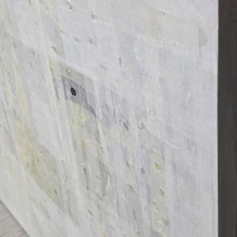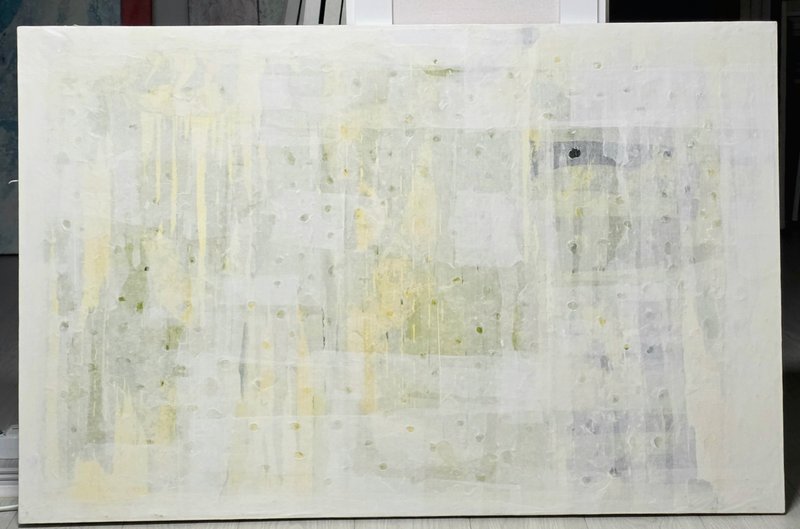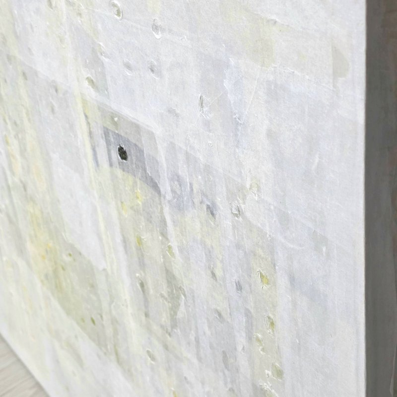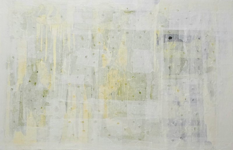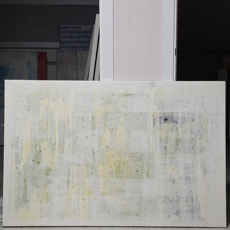 한지에서 느껴지는 은은함이나, 온화함, 자연스러움 등은 다른 매체에서 느낄 수 없는 고유한 시각적, 정서적 체험을 선사합니다. 또한 한국 현대미술에서 한지는 이제 한국적인 미감을 구현하는 것을 넘어 인간의 다양한 감정을 섬세하게 함축하고 드러내는 조형 도구로써 응용되고 있습니다. 김은미 작가의 작업도 한지를 붙이고 찢고 주름으로 표현하기도 하는 중첩의 기법으로 제작됩니다. 한지를 통해 화면 안에서 새로운 이미지를 생성하거나 그것들의 조합을 통해 내적 감성을 투명하게 쏟아내는 것이죠. 이렇게 작품 속 비구상의 서정적인 풍경은 구체적인 심상에 근거를 두지만, 작가는 이를 연상할 수 있는 최소한의 단서만을 남겨 감상자의 상상력을 유도합니다. 비로소 멈추었을 때 얻을 수 있는 사색의 시간을 이 작품과 함께 가져 보는 건 어떨까요?