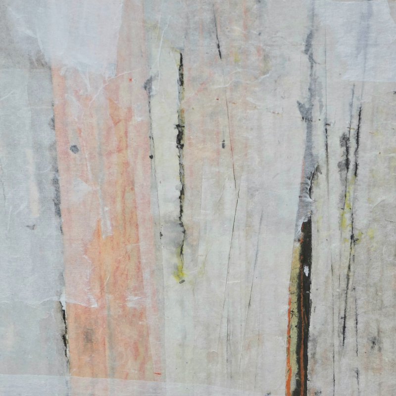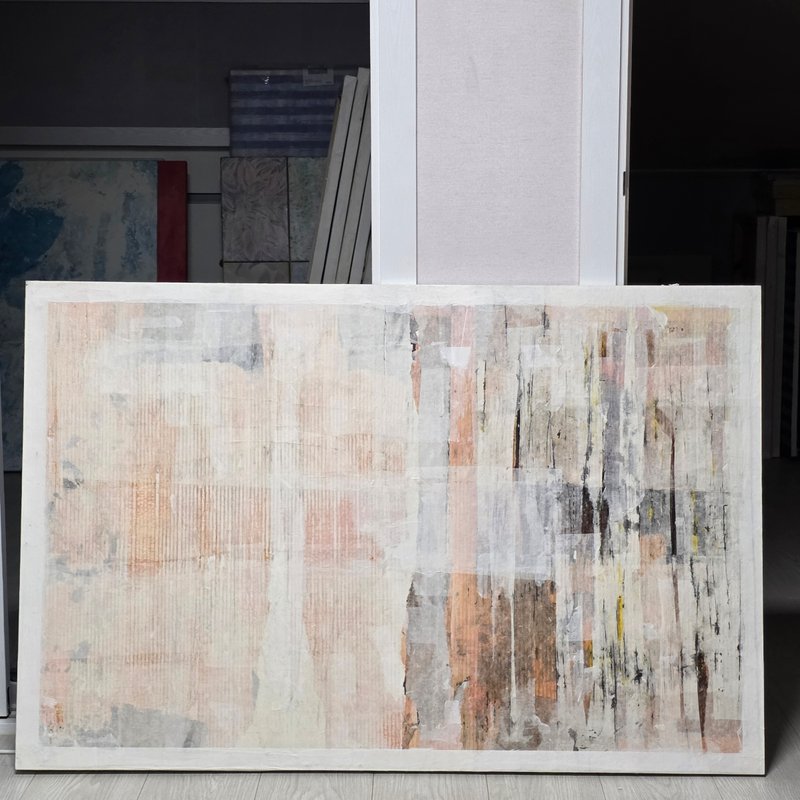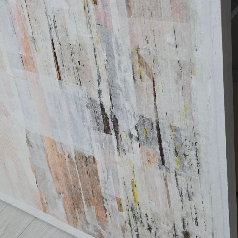 한지에서 느껴지는 은은함이나, 온화함, 자연스러움 등은 다른 매체에서 느낄 수 없는 고유한 시각적, 정서적 체험을 선사합니다. 또한 한국 현대미술에서 한지는 이제 한국적인 미감을 구현하는 것을 넘어 인간의 다양한 감정을 섬세하게 함축하고 드러내는 조형 도구로써 응용되고 있습니다. 김은미 작가의 작업도 한지를 붙이고 찢고 주름으로 표현하기도 하는 중첩의 기법으로 제작됩니다. 한지를 통해 화면 안에서 새로운 이미지를 생성하거나 그것들의 조합을 통해 내적 감성을 투명하게 쏟아내는 것이죠. 이렇게 작품 속 비구상의 서정적인 풍경은 구체적인 심상에 근거를 두지만, 작가는 이를 연상할 수 있는 최소한의 단서만을 남겨 감상자의 상상력을 유도합니다. 비로소 멈추었을 때 얻을 수 있는 사색의 시간을 이 작품과 함께 가져 보는 건 어떨까요?