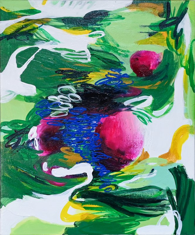 김연옥 작가는 한 개인 내면의 무수한 감정들과 이미지, 그 밖의 복합적인 것들을 하나의 회화적 화면에 구현하고자 한다. 기존에 작가는 주로 ‘달항아리’가 작품 화면에 명료하게 가득 차 있는 작품들을 지속적으로 작업하곤 했다. 작가에게 달항아리란 도자기 관련 일을 하던 아버지, 그리고 이와 얽혀있는 어린 시절 추억의 매개체로서 작용했다. 다만 해당 작품에서 작가는 달항아리의 명료한 형태를 표현하기보다, 물감의 다채로운 표정과 함께 저마다의 질료성이 느껴지는 터치와 선들로 화면을 메우고 있다. 작품 속 이 흔적들은 작가의 기억과 감정들을 단서 삼아 파생된 흔적, 얼룩, 기호, 무늬이다. 이들이 모여 한 화면 속에 정서와 여운을 동반하며 다채로운 것을 연상시키는 시각적 이미지로 나타나 있는 것이다.