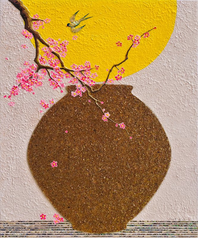 최원숙 작가는 민화를 현대적으로 해석해 시공간의 흐름과 과거에 대한 그리움, 어린 시절 추억을 화폭에 담았다. 민화의 전통적인 소재를 사용하지만, 전혀 다른 재료와 표현 방식(황토를 붙여 상감기법으로 조각, 끊음질 기법을 사용한 나전 무늬 넣기)을 구현함으로써 작업 모티브는 민화에 대한 재해석과 현대적 변용에 근거하게 된다. 작가는 희로애락이 담긴 인생을 꽃에 비유하여, 주변에서 흔히 볼 수 있는 연꽃, 모란, 양귀비 등을 주요한 소재로 삼아 다양한 기호, 물질과 결합한다. 이로써 인간적인 염원과 소망들이 그림 속에 한데 묶여 섬세하고 화려하게, 때론 차분하고 수수하게 유기적으로 어우러진 미학적 특징을 보여준다. 이렇게 작가의 조형 속에 새로이 자리 잡은 다양한 소재들은 민화에서와 같이 인간의 삶과 유관한 의미를 상징하며, 관람자로 하여금 깊은 울림과 공감, 설득을 불러일으킨다.
