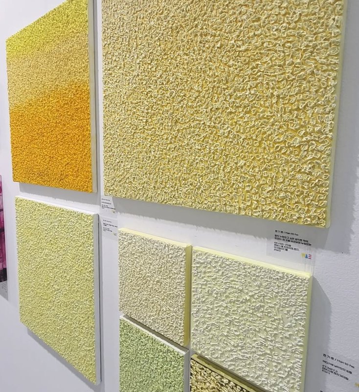 이 추상 작품은 단순히 순간적인 감정 분출의 산물로만 볼 수 없습니다. 한기호 작가의 작품을 이해하기 위해서는 작품의 질감과 색을 유의 깊게 볼 필요가 있습니다. 반복해서 찍은 점들이 만들어내는 진동, 구겨진 휴지 위로 두텁게 덧칠해진 물감의 진득한 질감에는 내면의 감정 기록을 넘어 그것을 해석하고 승화시키는 방법에 대한 고민이 담겨 있습니다. 메시지를 전달하기 위한 효과적인 재료와 표현에 대한 진지한 고민을 통해 탄생한 작품은 감상자에게도 특별하고 새로운 경험을 안겨줍니다. 작품이 선사하는 이색적인 경험과 그 안에서 발견되는 목소리에 귀를 기울여 보면, 세상을 바라보는 시각이 넓어지는 것을 느낄 수 있을 것입니다.