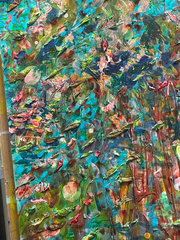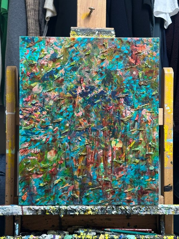 이 추상 작품은 단순히 순간적인 감정 분출의 산물로만 볼 수 없습니다. 한기호 작가의 작품을 이해하기 위해서는 작품의 질감과 색을 유의 깊게 볼 필요가 있습니다. 반복해서 찍은 점들이 만들어내는 진동, 구겨진 휴지 위로 두텁게 덧칠해진 물감의 진득한 질감에는 내면의 감정 기록을 넘어 그것을 해석하고 승화시키는 방법에 대한 고민이 담겨 있습니다. 메시지를 전달하기 위한 효과적인 재료와 표현에 대한 진지한 고민을 통해 탄생한 작품은 감상자에게도 특별하고 새로운 경험을 안겨줍니다. 작품이 선사하는 이색적인 경험과 그 안에서 발견되는 목소리에 귀를 기울여 보면, 세상을 바라보는 시각이 넓어지는 것을 느낄 수 있을 것입니다.