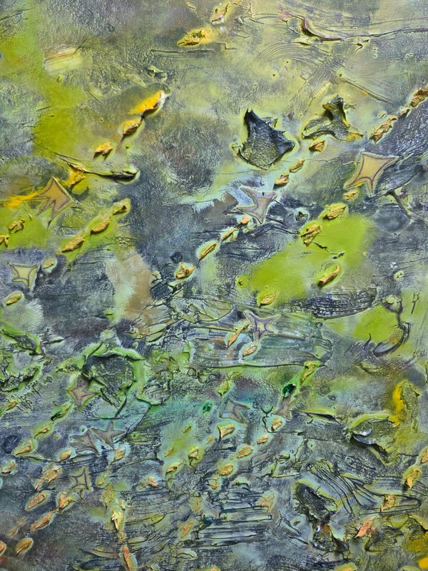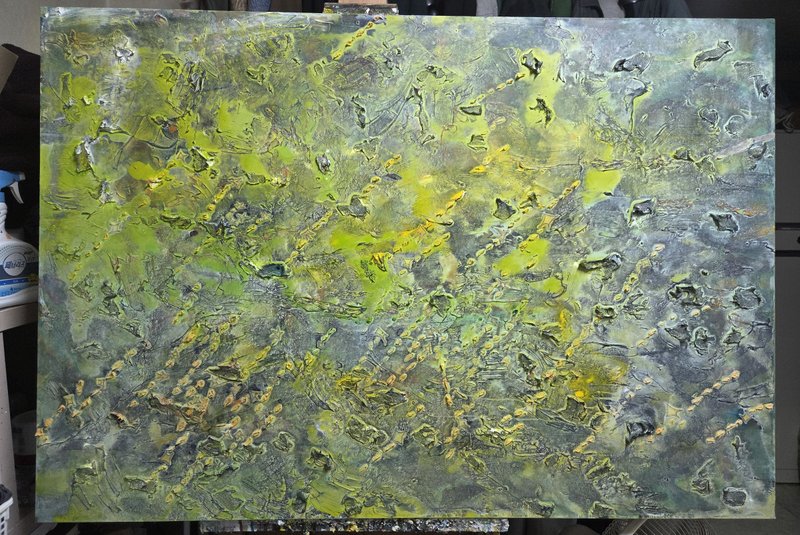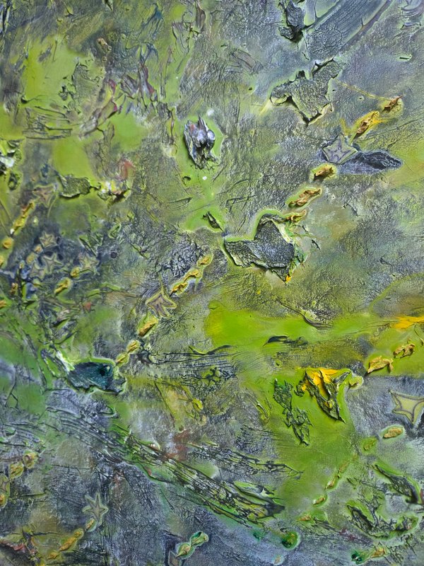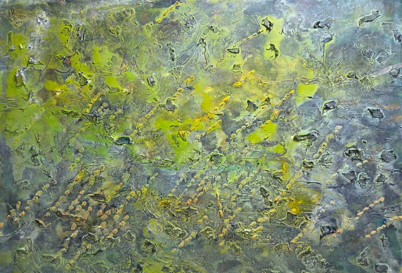 이 추상 작품은 단순히 순간적인 감정 분출의 산물로만 볼 수 없습니다. 한기호 작가의 작품을 이해하기 위해서는 작품의 질감과 색을 유의 깊게 볼 필요가 있습니다. 반복해서 찍은 점들이 만들어내는 진동, 구겨진 휴지 위로 두텁게 덧칠해진 물감의 진득한 질감에는 내면의 감정 기록을 넘어 그것을 해석하고 승화시키는 방법에 대한 고민이 담겨 있습니다. 메시지를 전달하기 위한 효과적인 재료와 표현에 대한 진지한 고민을 통해 탄생한 작품은 감상자에게도 특별하고 새로운 경험을 안겨줍니다. 작품이 선사하는 이색적인 경험과 그 안에서 발견되는 목소리에 귀를 기울여 보면, 세상을 바라보는 시각이 넓어지는 것을 느낄 수 있을 것입니다.