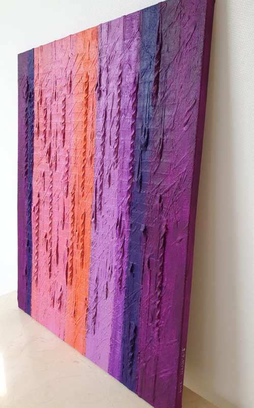 매일 반복되는 비슷한 일상일지라도 조금 더 예민한 감각으로 들여다보면 매번 다른 소중한 순간들과 감정들이 매 작품 속에서 다양한 색채로 표현되었습니다. 그렇기 때문에 송정현 작가의 작품들은 단일한 색조로 규정지을 수 없습니다. 내면의 색채들은 작가가 오리고 매듭짓고 붙여 만든 입체적인 표면과 그 사이사이의 틈이 만들어내는 호흡으로 세상과 소통합니다. 자유분방한 색채 표현에 독자적인 질감 표현이 더해져 한 층 더 친밀하고 생동감 있게 다가옵니다. 천이 짜일 때에 발생하는 가로줄과 세로줄의 매듭은 한 개인의 내면과 외부의 세계가 관계를 맺고 소통하는 과정을 닮아있습니다. 한 사람의 다양한 면모만큼이나 다양한 색채가 주는 위로를 느껴보세요.