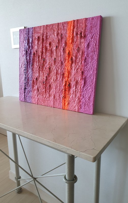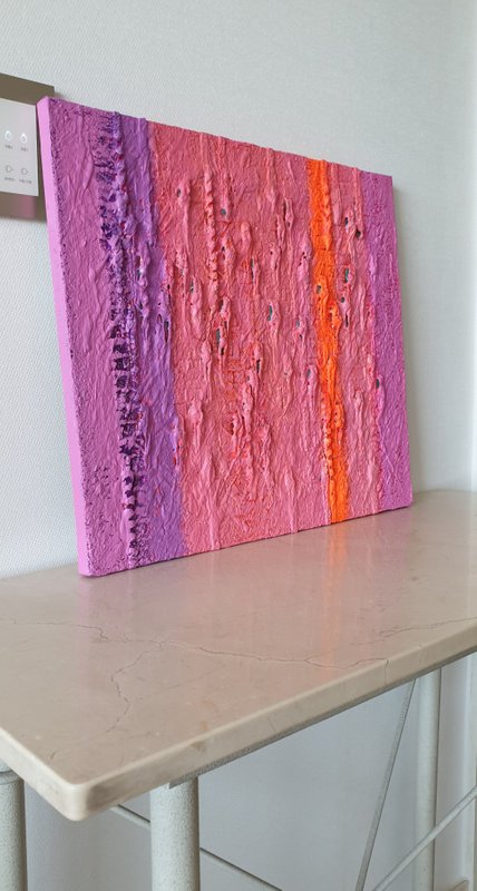 매일 반복되는 비슷한 일상일지라도 조금 더 예민한 감각으로 들여다보면 매번 다른 소중한 순간들과 감정들이 매 작품 속에서 다양한 색채로 표현되었습니다. 그렇기 때문에 송정현 작가의 작품들은 단일한 색조로 규정지을 수 없습니다. 내면의 색채들은 작가가 오리고 매듭짓고 붙여 만든 입체적인 표면과 그 사이사이의 틈이 만들어내는 호흡으로 세상과 소통합니다. 자유분방한 색채 표현에 독자적인 질감 표현이 더해져 한 층 더 친밀하고 생동감 있게 다가옵니다. 천이 짜일 때에 발생하는 가로줄과 세로줄의 매듭은 한 개인의 내면과 외부의 세계가 관계를 맺고 소통하는 과정을 닮아있습니다. 한 사람의 다양한 면모만큼이나 다양한 색채가 주는 위로를 느껴보세요.
