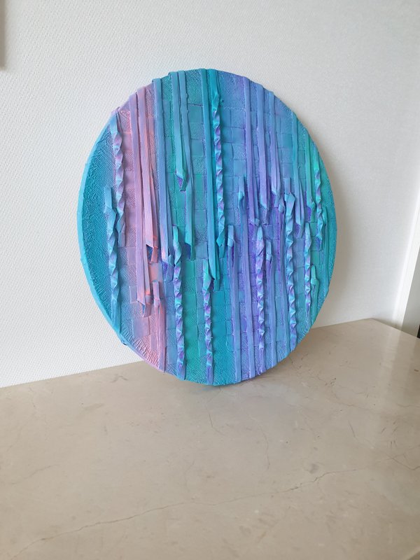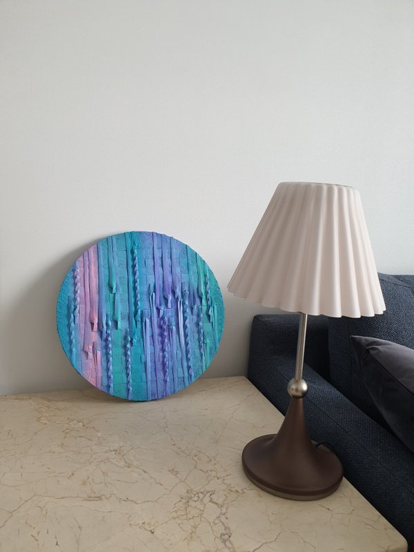 매일 반복되는 비슷한 일상일지라도 조금 더 예민한 감각으로 들여다보면 매번 다른 소중한 순간들과 감정들이 매 작품 속에서 다양한 색채로 표현되었습니다. 그렇기 때문에 송정현 작가의 작품들은 단일한 색조로 규정지을 수 없습니다. 내면의 색채들은 작가가 오리고 매듭짓고 붙여 만든 입체적인 표면과 그 사이사이의 틈이 만들어내는 호흡으로 세상과 소통합니다. 자유분방한 색채 표현에 독자적인 질감 표현이 더해져 한 층 더 친밀하고 생동감 있게 다가옵니다. 천이 짜일 때에 발생하는 가로줄과 세로줄의 매듭은 한 개인의 내면과 외부의 세계가 관계를 맺고 소통하는 과정을 닮아있습니다. 한 사람의 다양한 면모만큼이나 다양한 색채가 주는 위로를 느껴보세요.