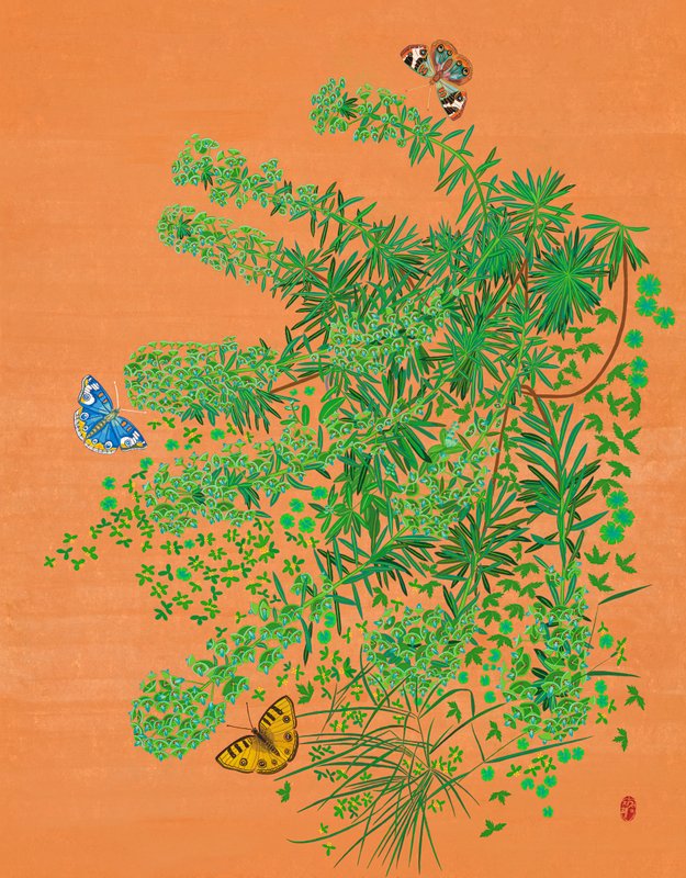 한국 전통회화의 대표적인 양식은 먹을 중심으로 한 수묵화와 채색에 방점을 둔 채색화로 나눌 수 있습니다. 이 중 한국의 전통 채색화는 밑그림이 되는 먹이 보이지 않을 정도로 색을 여러 번 덧발라 선명한 색상을 구현합니다. 특히 그 색상을 배치시키는 방식은 단청에서 볼 수 있듯 선명하고 화사한 배색을 추구합니다. 정지혜 작가의 작품은 색채에 대한 전통적인 미감을 잘 보여주면서 동시에 현대적인 구도와 작가 특유의 감성을 담고 있습니다. 정형화되지 않은 꽃과 나무 등의 소재는 전통적인 색채로 화사하고 선명하게 그려져 있습니다. 또한 정지혜 작가가 삶을 바라보는 긍정적인 시선은 작품에 온기를 불어넣어 독특한 감수성을 띠게 합니다. 정지혜 작가의 작품을 통해 나만의 힐링 스팟을 만드는 것은 어떨까요? 화사한 색채만큼 따스한 공기가 그 공간을 가득 채울 것입니다.
