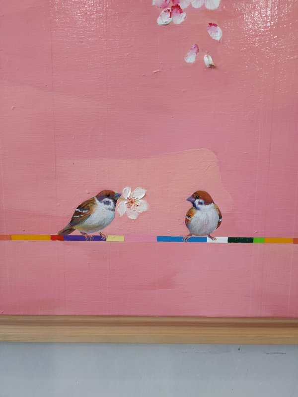 농업사회가 산업사회로 바뀔 때까지 변함없이 우리 곁에 있어 왔던 참새는 지금 비둘기에게 밀려 그 존재감이 희미해지긴 했지만, 아직도 우리는 수많은 참새들과 함께 살아가고 있다. 이미경 작가는 바로 이러한 참새를 바라보며 우리 주변에 존재하지만 그 소중함을 잊고 살았던 가족과 친구, 연인, 이웃들을 떠올리게 되었다고 한다. 이에 착안하여 작가는 우리 이웃들의 모습을 참새의 이미지로, 또 우리가 살아가는 도시의 풍경을 다양한 색이 반복되는 색동으로 표현했다. 차가운 콘크리트 건물들을 따스한 색이 가득한 색동으로 표현한 이유는 삭막한 도시의 외형보다 그 안의 사는 사람들의 따스한 마음과 행복한 을 강조하고 싶었기 때문이다. 이미경 작가가 작품을 통해 말하고자 하는 핵심 주제 역시 바로 '행복'이다. 결국 작가는 인간과 자연이 도시 속에서 어우러지는 삶 그리고 그 속에서의 쉼이 바로 행복의 시작임을 전하고 싶었던 것이다.