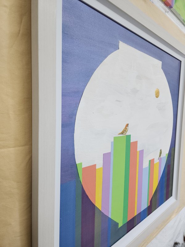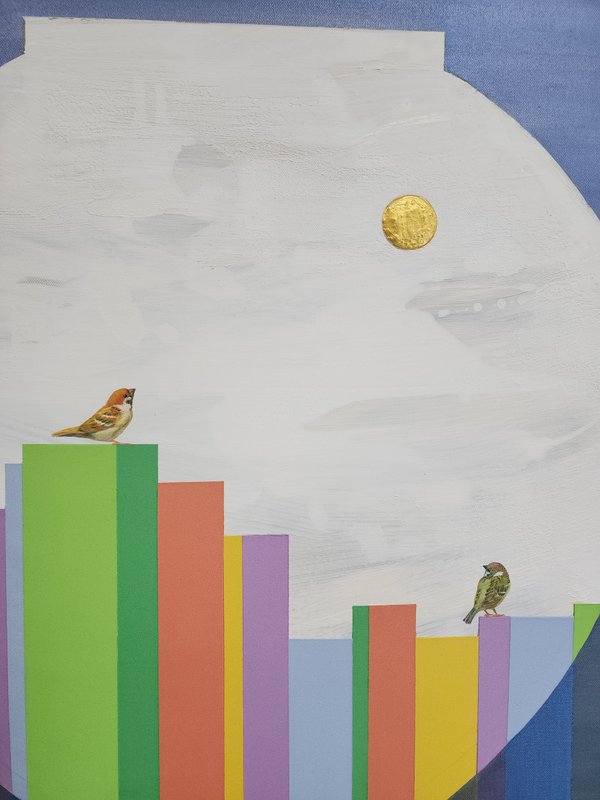도시 속에 살아가고 있는 현대인의 삶은 삭막한 회색빛이라고 이야기합니다. 많은 문학가들은 도시 속 소외된 인간들의 삶에 대해 이야기하고, 화가들은 자신들의 표현방식으로 현대의 문제점들을 지적하곤 합니다. 하지만 과연 우리의 삶이 삭막하고 괴롭기만 할까요? 이미경 작가의 생각은 좀 다릅니다. 작가는 다양한 색으로 도시의 풍경을 묘사하고 작고 귀여운 참새들로 현대인을 나타냈습니다. 참새는 동양에서 기쁨을 가져다주는 새로 알려져 있습니다. 작가는 이런 참새의 모습을 통해 도시에서 살아가는 사람들의 소박하면서도 행복한 삶의 이야기를 그리고자 했습니다. 그 결과 회색빛 콘크리트 도시는 한국적인 정서가 묻어있는 알록달록한 색동의 도시로 바뀌었습니다. 그동안 무겁고 답답한 도시의 풍경화에 지쳐있다면, 이미경 작가의 작품으로 분위기를 환기시켜보면 어떨까요? 작품을 바라보며 미소를 머금게 하는 여유와 행복을 얻어가실 수 있을 것입니다.