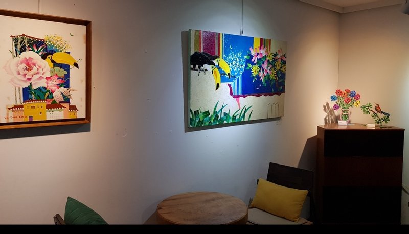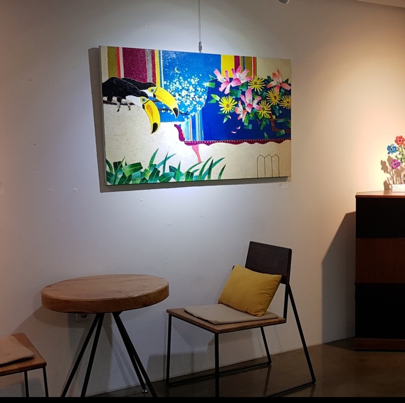 강라희 작가의 작품들은 오아시스라는 제목을 가지고 있습니다. 오아시스는 사막과 같이 척박한 환경에서 솟아나는 샘으로 생태계의 순환을 가능하게 하는 지역입니다. 강라희 작가는 그 오아시스를 커다란 부리를 가진 투칸새와 활짝 핀 꽃이 사는 곳으로 묘사합니다. 꽃과 투칸새는 캔버스의 중앙에 위치하고 주변은 빨간색, 파란색과 같은 강렬한 색으로 마무리되어 있습니다. 배경의 강렬한 색은 중앙의 소재들을 돋보이게 하면서 동시에 주변에서 고립된 지역인 오아시스를 연상케 합니다. 강라희 작가는 색과 구도 그리고 독특한 소재의 선택을 통해 자신만의 오아시스를 시각적으로 표현하고 있습니다. 실제의 오아시스보다 훨씬 강렬하고 화려하게 그려진 작품은 현실 세계에서 꿈꾸는 이상 세계의 환영이라 할 수 있습니다. 강라희 작가의 작품을 통해 집 안에 나만의 오아시스를 만들어 보는 것은 어떨까요?