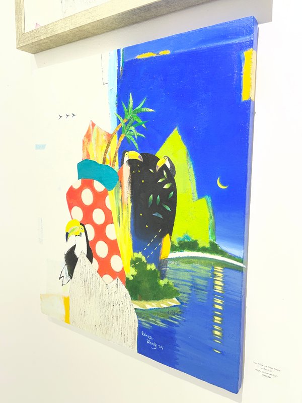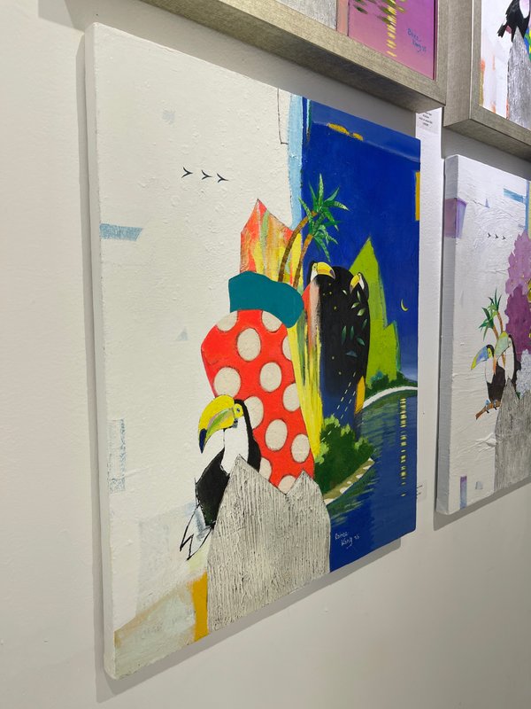 강라희 작가의 작품들은 오아시스라는 제목을 가지고 있습니다. 오아시스는 사막과 같이 척박한 환경에서 솟아나는 샘으로 생태계의 순환을 가능하게 하는 지역입니다. 강라희 작가는 그 오아시스를 커다란 부리를 가진 투칸새와 활짝 핀 꽃이 사는 곳으로 묘사합니다. 꽃과 투칸새는 캔버스의 중앙에 위치하고 주변은 빨간색, 파란색과 같은 강렬한 색으로 마무리되어 있습니다. 배경의 강렬한 색은 중앙의 소재들을 돋보이게 하면서 동시에 주변에서 고립된 지역인 오아시스를 연상케 합니다. 강라희 작가는 색과 구도 그리고 독특한 소재의 선택을 통해 자신만의 오아시스를 시각적으로 표현하고 있습니다. 실제의 오아시스보다 훨씬 강렬하고 화려하게 그려진 작품은 현실 세계에서 꿈꾸는 이상 세계의 환영이라 할 수 있습니다. 강라희 작가의 작품을 통해 집 안에 나만의 오아시스를 만들어 보는 것은 어떨까요?