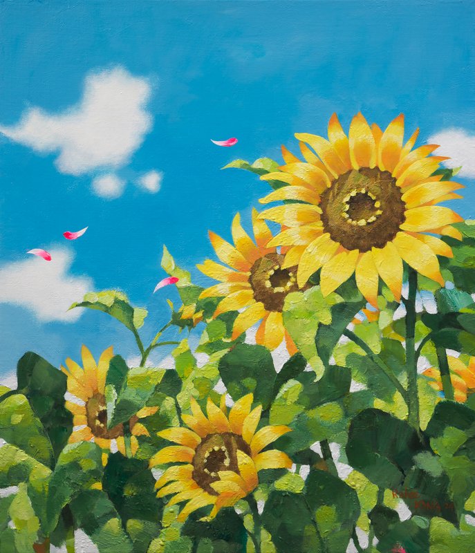 강라희 작가의 작품들은 오아시스라는 제목을 가지고 있습니다. 오아시스는 사막과 같이 척박한 환경에서 솟아나는 샘으로 생태계의 순환을 가능하게 하는 지역입니다. 강라희 작가는 그 오아시스를 커다란 부리를 가진 투칸새와 활짝 핀 꽃이 사는 곳으로 묘사합니다. 꽃과 투칸새는 캔버스의 중앙에 위치하고 주변은 빨간색, 파란색과 같은 강렬한 색으로 마무리되어 있습니다. 배경의 강렬한 색은 중앙의 소재들을 돋보이게 하면서 동시에 주변에서 고립된 지역인 오아시스를 연상케 합니다. 강라희 작가는 색과 구도 그리고 독특한 소재의 선택을 통해 자신만의 오아시스를 시각적으로 표현하고 있습니다. 실제의 오아시스보다 훨씬 강렬하고 화려하게 그려진 작품은 현실 세계에서 꿈꾸는 이상 세계의 환영이라 할 수 있습니다. 강라희 작가의 작품을 통해 집 안에 나만의 오아시스를 만들어 보는 것은 어떨까요?