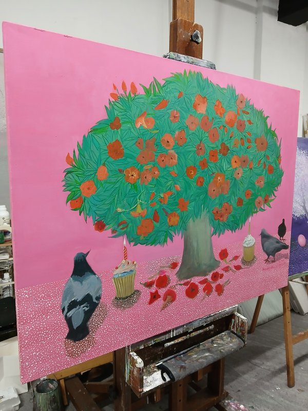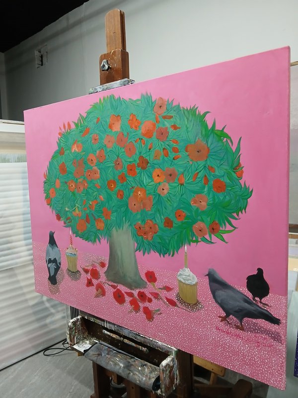 한광숙 작가의 작품에는 항상 나무가 등장합니다. 그런데 이 나무들이 주변에서 흔히 보는 것처럼 친숙한가요? 어딘가 낯설게 느껴지진 않나요? 작품 속 나무들은 그라데이션 기법을 통해 경계가 모호하게 지워져 마치 꿈결에 비친 풍경처럼 몽환적인 풍경으로 보입니다. 또한 커다란 사탕과 조그만 버스와 같이 크기가 뒤죽박죽인 사물과 배치되어 나무가 있는 풍경을 이상한 나라의 한 장면으로 보이게 합니다. 이와 같이 일상적인 사물이 논리의 법칙을 벗어난 채 제시되는 것을 데페이즈멍 기법이라고 합니다. 한광숙 작가는 그라데이션 기법과 데페이즈멍 기법을 사용해서 친숙한 나무를 낯설어 보이게 합니다. 그럼으로써 작품 속 나무는 일반적인 풍경화의 소재를 넘어선 강한 존재감을 가지게 됩니다. 한광숙 작가의 작품과 함께 친숙한 일상을 특별하고 아름답게 만들어 보는 것은 어떨까요?