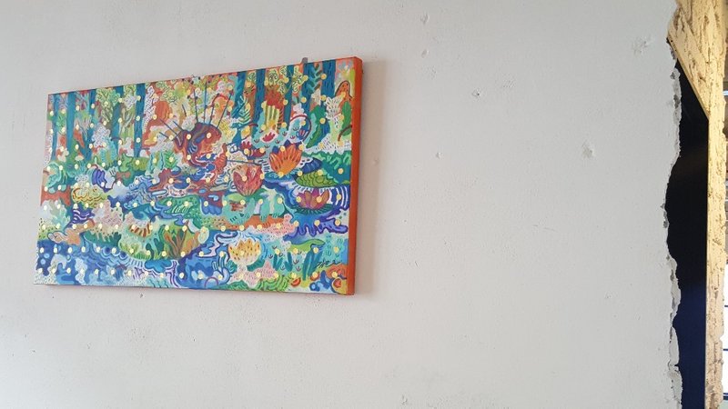 김근아 작가의 작품을 보면 볼수록 생동감이 넘칩니다. 마치 화면 속에서 펄떡이며 살아 나올 것 같은 상상의 동물들과 그 안에서 함께 충만한 삶을 누리는 사람들의 모습을 관찰할 수 있습니다. 그의 작품은 삶에 지치고 권태로움을 느끼는 현대인의 삶에 마치 오아시스 같은 충만함을 제공합니다. 우리는 특히 인물들의 생동하는 움직임, 생명이 있는 듯한 사물들, 이들을 아우르는 강한 색채를 유심히 살펴볼 수 있습니다. 일종의 종교적 상징이 담긴 듯한 작업들, 신화를 구현한 듯한 작가의 상상력이 인상적입니다. 강한 에너지를 전달하는 작가의 작업을 함께 경험해볼 수 있길 바랍니다.