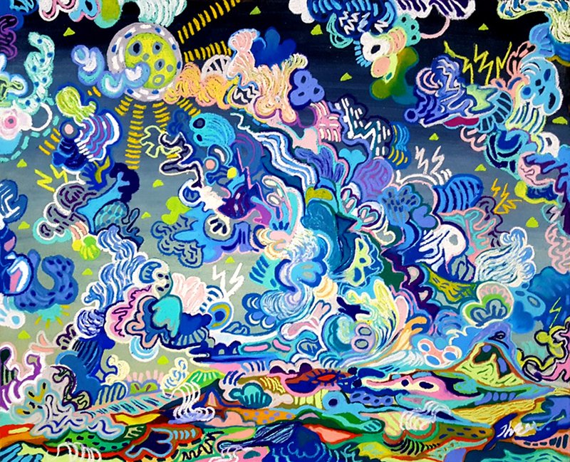 김근아 작가의 작품을 보면 볼수록 생동감이 넘칩니다. 마치 화면 속에서 펄떡이며 살아 나올 것 같은 상상의 동물들과 그 안에서 함께 충만한 삶을 누리는 사람들의 모습을 관찰할 수 있습니다. 그의 작품은 삶에 지치고 권태로움을 느끼는 현대인의 삶에 마치 오아시스 같은 충만함을 제공합니다. 우리는 특히 인물들의 생동하는 움직임, 생명이 있는 듯한 사물들, 이들을 아우르는 강한 색채를 유심히 살펴볼 수 있습니다. 일종의 종교적 상징이 담긴 듯한 작업들, 신화를 구현한 듯한 작가의 상상력이 인상적입니다. 강한 에너지를 전달하는 작가의 작업을 함께 경험해볼 수 있길 바랍니다.