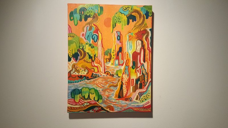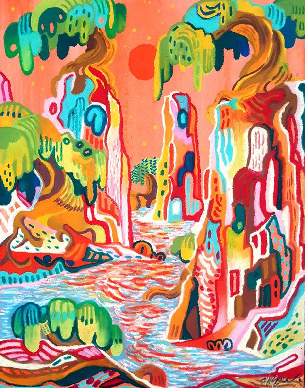김근아 작가의 작품을 보면 볼수록 생동감이 넘칩니다. 마치 화면 속에서 펄떡이며 살아 나올 것 같은 상상의 동물들과 그 안에서 함께 충만한 삶을 누리는 사람들의 모습을 관찰할 수 있습니다. 그의 작품은 삶에 지치고 권태로움을 느끼는 현대인의 삶에 마치 오아시스 같은 충만함을 제공합니다. 우리는 특히 인물들의 생동하는 움직임, 생명이 있는 듯한 사물들, 이들을 아우르는 강한 색채를 유심히 살펴볼 수 있습니다. 일종의 종교적 상징이 담긴 듯한 작업들, 신화를 구현한 듯한 작가의 상상력이 인상적입니다. 강한 에너지를 전달하는 작가의 작업을 함께 경험해볼 수 있길 바랍니다.