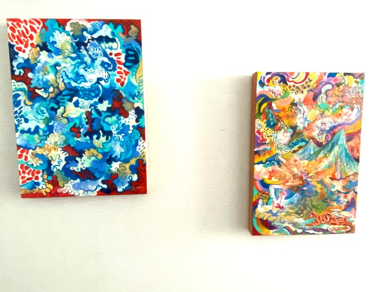 김근아 작가는 설화와 같은 상상이 깃든 세계에 대한 작업을 한다. 그의 작품은 언뜻 보기에 탱화와 같이 뚜렷하고 강한 컬러감과 표현 방식을 가지고 있기에 몽환적이고 신비로운 분위기를 자아낸다. 그의 작품 속에서는 인간과 동물들이 함께 조화를 이루고 살고 하늘과 땅이 얽히고설키듯 뒤섞여 있다. 이런 미지의 영역에 대한 작가적 상상력을 보는 것만으로도 큰 즐거움이 있다. 원시적이고 근원적인 힘이 느껴지는 김근아 작가의 작업에는 에너지가 충만하다. 그의 작품은 지친 현대인에게 마치 오아시스 같은 또는 상상의 나래를 펼칠 수 있도록 도와준다.