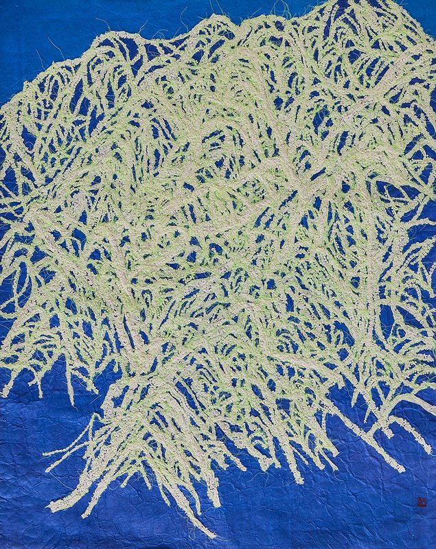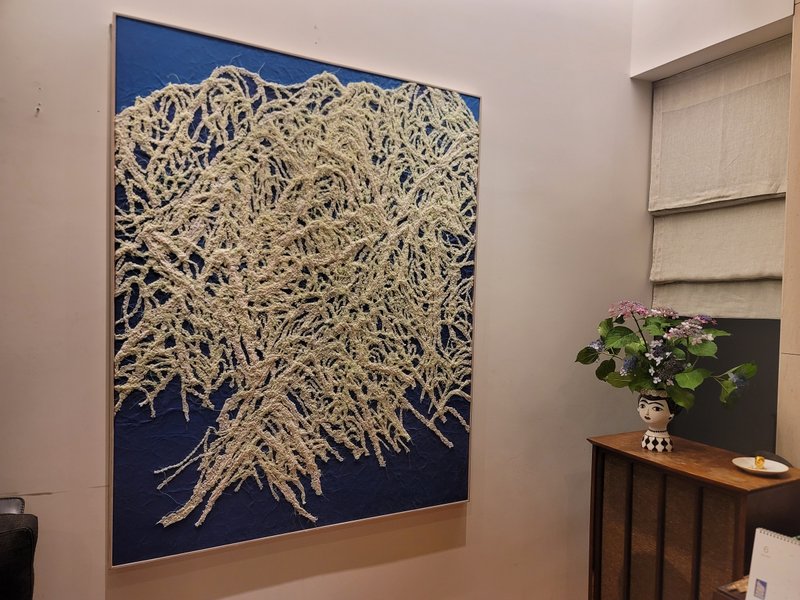이윤정 작가의 작품에서 가장 눈에 띄는 요소는 자연의 모습을 이루고 있는 끈입니다. 여러 색상의 끈들이 얽히고설키어 꽃, 바위, 산 등을 만들어냅니다. 이는 레이스 끈에 안료를 적셔 한지에 찍어낸 뒤 칼로 그 부분만을 잘라 완성된 것으로, 일반적인 수묵채색화와는 다른 느낌을 자아냅니다. 수묵의 농담과 번짐으로 이루어지지는 않았지만, 넓은 벽 자체를 여백으로 활용하여 동양화의 미를 살려냅니다. 작가에게 있어 끈은 작품을 위한 수단이기 이전에 인간의 삶을 비유하는 개체입니다. 다양한 가닥들이 꼬인 채 공존해가는 모습이라거나, 굴곡을 그리며 계속하여 이어지는 게 인간관계 혹은 인생과 닮아 있었다고 합니다. 이처럼 끈은 인간과 자연이 품고 있는 수 만년 세월의 증거인 주름을 가장 효과적으로 표현해냅니다. 독특한 조형과 작품관을 담은 이윤정 작가의 작품과 함께 공간을 자연의 여백으로 바꾸어 보는 것은 어떨까요?