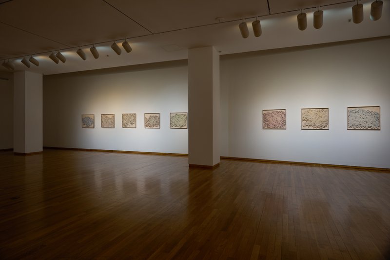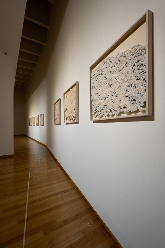 시작과 끝을 알 수 없는 끈들은 서로 엉키어 꽃이 되고 바위가 되며 산을 이룬다. 끈이라 하면 일반적으로 물건을 묶거나 이어주는 물체를 의미하지만, 이윤정 작가에게 있어 끈은 자연이며 인간의 삶을 의미한다. 다양한 굴곡을 그려가면서 끊어지지 않고 이어지는 끈과 같은 인생. 여러 가닥들이 얽히며 공존해가는 인간관계와 일맥상통한다. 이는 보이는 끈으로 보이지 않는 끈을 그려내는 일이다. 끈은 작가에게 추상적 은유이자 동시에 물리적 수단이다. 레이스 끈에 먹물을 적신 뒤 한지에 찍어내어 꽃과 바위, 산의 굴곡을 따라간다. 끈이 구겨진 주름이 땅의 흐름을 읽고 그린다. 이 위에 색채를 입히고 꼬임을 강조하는 점을 찍어 끈으로 그린 산수를 완성한다. 끈을 제외한 여백을 잘라낸 형태 그대로 흰 벽에 걸면 산수를 품은 벽이 끝없는 하늘과 바다가 된다. 이처럼 자유로운 끈은 무엇이든 만들어내고, 주변을 어떤 풍경이든 변하게 한다. 마침내 끈의 유희가 시작되었다.