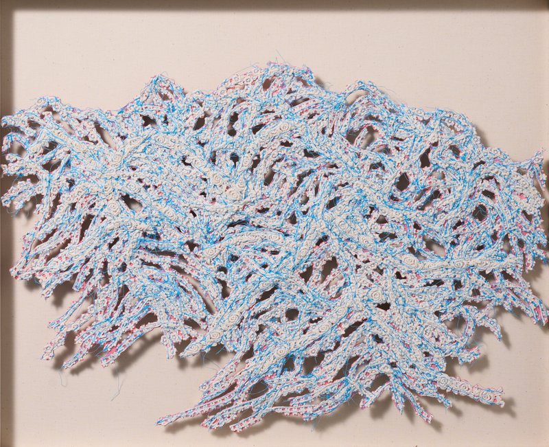 이윤정 작가의 작품에서 가장 눈에 띄는 요소는 자연의 모습을 이루고 있는 끈입니다. 여러 색상의 끈들이 얽히고설키어 꽃, 바위, 산 등을 만들어냅니다. 이는 레이스 끈에 안료를 적셔 한지에 찍어낸 뒤 칼로 그 부분만을 잘라 완성된 것으로, 일반적인 수묵채색화와는 다른 느낌을 자아냅니다. 수묵의 농담과 번짐으로 이루어지지는 않았지만, 넓은 벽 자체를 여백으로 활용하여 동양화의 미를 살려냅니다. 작가에게 있어 끈은 작품을 위한 수단이기 이전에 인간의 삶을 비유하는 개체입니다. 다양한 가닥들이 꼬인 채 공존해가는 모습이라거나, 굴곡을 그리며 계속하여 이어지는 게 인간관계 혹은 인생과 닮아 있었다고 합니다. 이처럼 끈은 인간과 자연이 품고 있는 수 만년 세월의 증거인 주름을 가장 효과적으로 표현해냅니다. 독특한 조형과 작품관을 담은 이윤정 작가의 작품과 함께 공간을 자연의 여백으로 바꾸어 보는 것은 어떨까요?