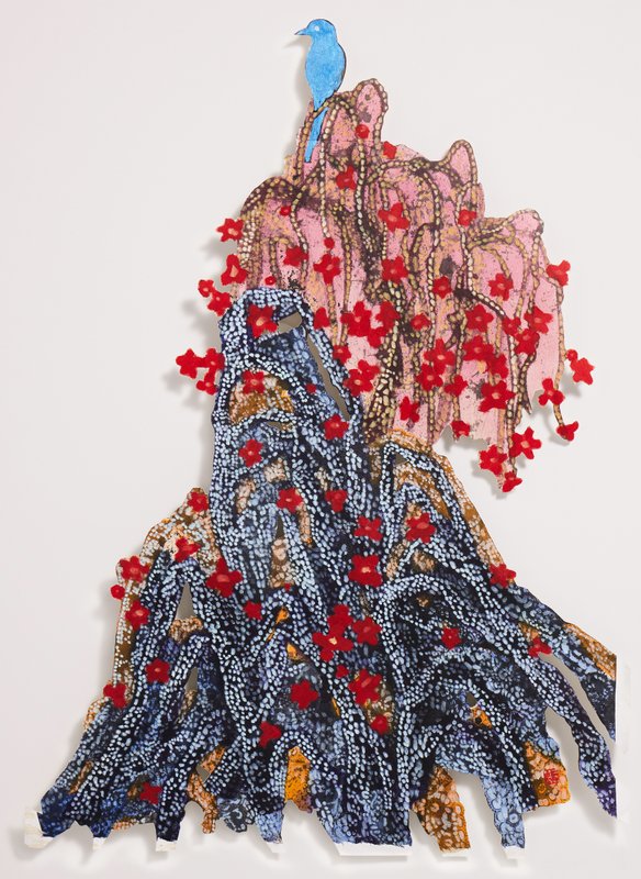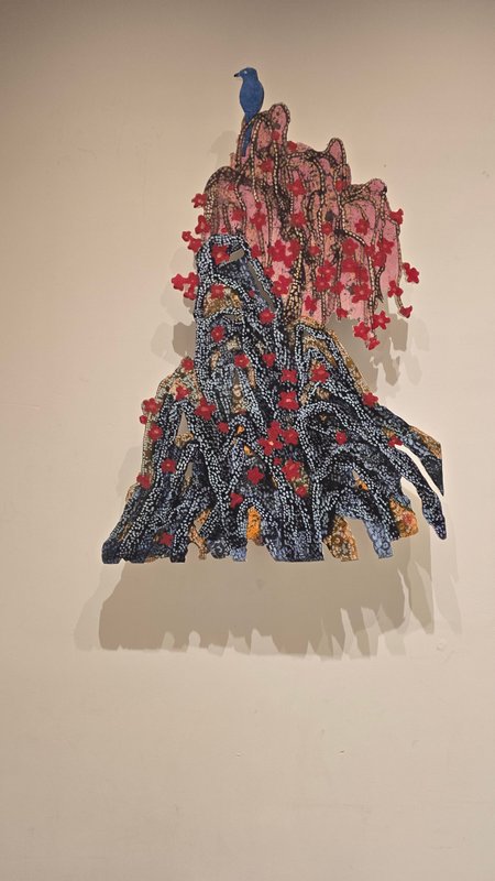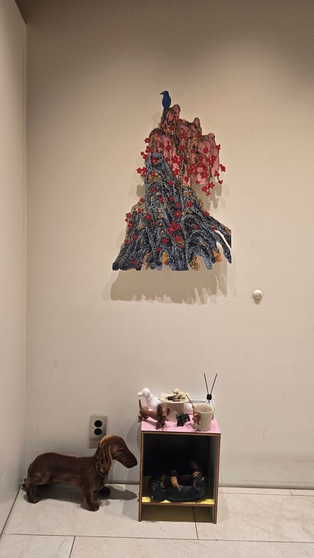 이윤정 작가의 작품에서 가장 눈에 띄는 요소는 자연의 모습을 이루고 있는 끈입니다. 여러 색상의 끈들이 얽히고설키어 꽃, 바위, 산 등을 만들어냅니다. 이는 레이스 끈에 안료를 적셔 한지에 찍어낸 뒤 칼로 그 부분만을 잘라 완성된 것으로, 일반적인 수묵채색화와는 다른 느낌을 자아냅니다. 수묵의 농담과 번짐으로 이루어지지는 않았지만, 넓은 벽 자체를 여백으로 활용하여 동양화의 미를 살려냅니다. 작가에게 있어 끈은 작품을 위한 수단이기 이전에 인간의 삶을 비유하는 개체입니다. 다양한 가닥들이 꼬인 채 공존해가는 모습이라거나, 굴곡을 그리며 계속하여 이어지는 게 인간관계 혹은 인생과 닮아 있었다고 합니다. 이처럼 끈은 인간과 자연이 품고 있는 수 만년 세월의 증거인 주름을 가장 효과적으로 표현해냅니다. 독특한 조형과 작품관을 담은 이윤정 작가의 작품과 함께 공간을 자연의 여백으로 바꾸어 보는 것은 어떨까요?
