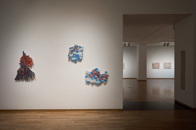 시작과 끝을 알 수 없는 끈들은 서로 엉키어 꽃이 되고 바위가 되며 산을 이룬다. 끈이라 하면 일반적으로 물건을 묶거나 이어주는 물체를 의미하지만, 이윤정 작가에게 있어 끈은 자연이며 인간의 삶을 의미한다. 다양한 굴곡을 그려가면서 끊어지지 않고 이어지는 끈과 같은 인생. 여러 가닥들이 얽히며 공존해가는 인간관계와 일맥상통한다. 이는 보이는 끈으로 보이지 않는 끈을 그려내는 일이다. 끈은 작가에게 추상적 은유이자 동시에 물리적 수단이다. 레이스 끈에 먹물을 적신 뒤 한지에 찍어내어 꽃과 바위, 산의 굴곡을 따라간다. 끈이 구겨진 주름이 땅의 흐름을 읽고 그린다. 이 위에 색채를 입히고 꼬임을 강조하는 점을 찍어 끈으로 그린 산수를 완성한다. 끈을 제외한 여백을 잘라낸 형태 그대로 흰 벽에 걸면 산수를 품은 벽이 끝없는 하늘과 바다가 된다. 이처럼 자유로운 끈은 무엇이든 만들어내고, 주변을 어떤 풍경이든 변하게 한다. 마침내 끈의 유희가 시작되었다.