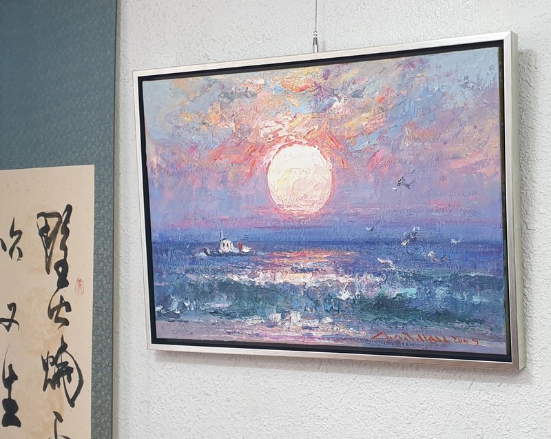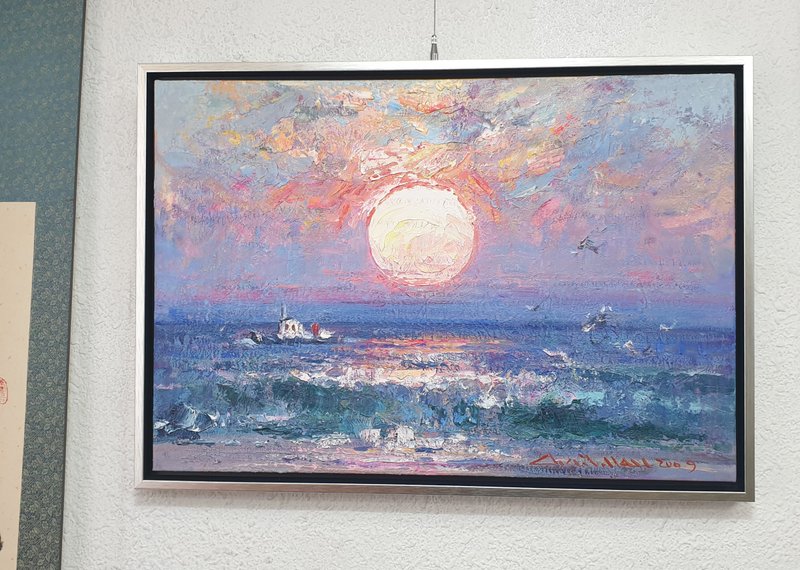 조용하고 평화로운 바다가 그려진 작품에서 부드럽고 신비로운 분위기가 느껴집니다. 외진 어촌마을에서 태어나 한없이 넓은 하늘과 바다를 보고 자란 차일만 작가가 긴 시간 자연에 대한 연구를 하고, 이를 얼마나 이해를 했는지 작품 전체의 색과 구도의 조화를 통해 이야기하듯 보여줍니다. 대자연의 아름다움이 감상자에게 고스란히 전해지며, 태양빛을 담고 있는 작품은 평온한 감성을 자극합니다. 강렬한 빛을 발산하던 태양이 시간이 지나 어둠 속에 여운을 남기며 사라지는 모습을 담은 작품을 통해 신비로운 자연에 무한한 경외감을 느껴보시길 바랍니다.