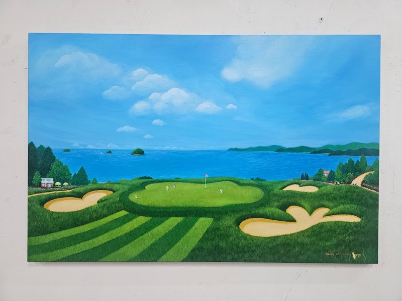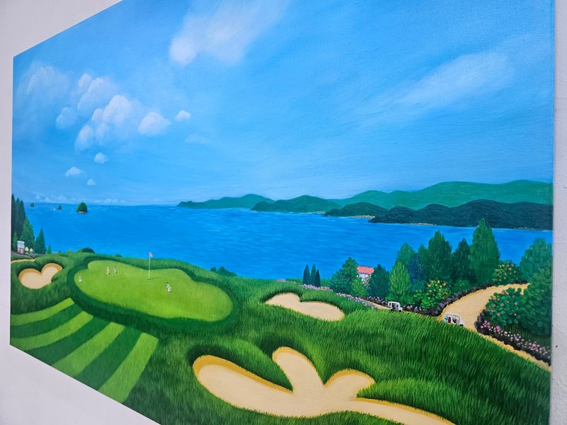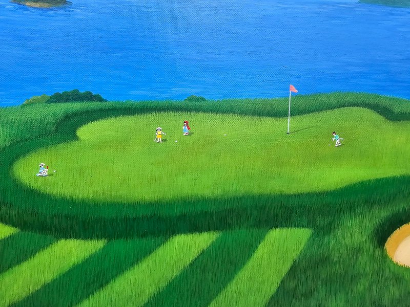 곽미영 작가는 세필로 덧칠을 반복하는 아크릴 작업을 통해 자연스럽고 싱그러운 초록빛을 구현해낸다. 시간과 공이 많이 들어간 흔적이 역력하지만, 그 공수는 그림을 마주한 감상자에게 더할 나위 없이 편안한 심상을 전달한다. 차 밭, 굴곡진 시골길, 작가의 기억에 남아있는 장소는 조금씩 그 모습을 다듬으며 화면 위에 펼쳐지는데, 푸른 초록빛을 중점으로 확장이 되는 이 풍경은 익숙하지만 현실적이지 않은 동화 같은 분위기를 자아낸다. 특별하지 않는 소소한 일상의 모습이 기하학적인 무늬로 가득 채워진 잔디밭이 되고, 동심을 자극하는 작은 생명체들이 더해지며, 자연과 인간 내면에 차지하고 있는 순수성의 가치를 다시금 일깨워준다.
