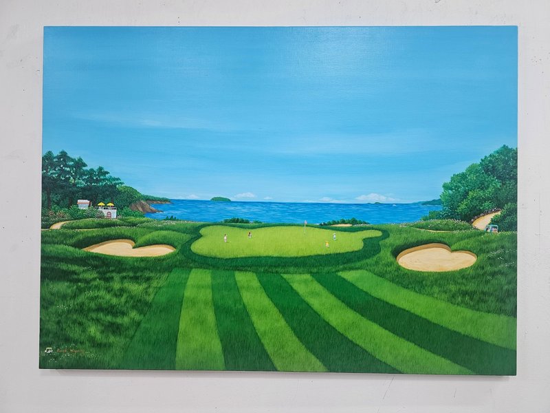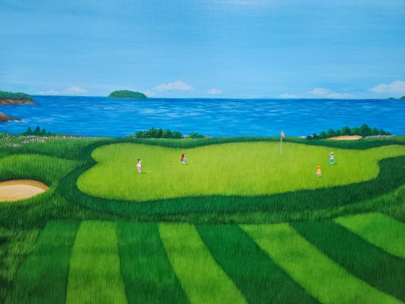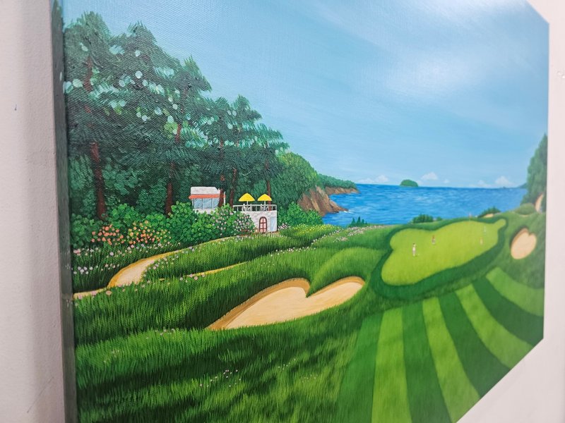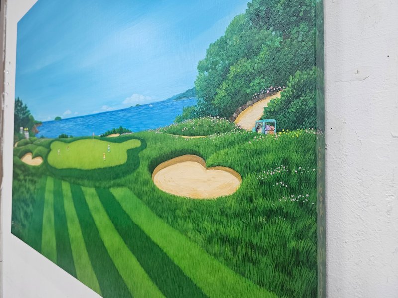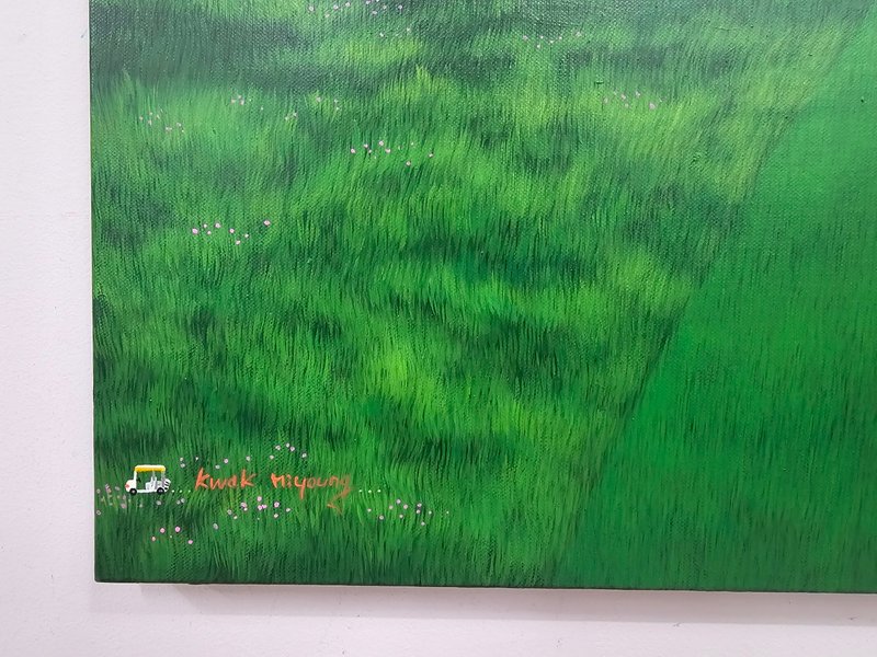 곽미영 작가는 세필로 덧칠을 반복하는 아크릴 작업을 통해 자연스럽고 싱그러운 초록빛을 구현해낸다. 시간과 공이 많이 들어간 흔적이 역력하지만, 그 공수는 그림을 마주한 감상자에게 더할 나위 없이 편안한 심상을 전달한다. 차 밭, 굴곡진 시골길, 작가의 기억에 남아있는 장소는 조금씩 그 모습을 다듬으며 화면 위에 펼쳐지는데, 푸른 초록빛을 중점으로 확장이 되는 이 풍경은 익숙하지만 현실적이지 않은 동화 같은 분위기를 자아낸다. 특별하지 않는 소소한 일상의 모습이 기하학적인 무늬로 가득 채워진 잔디밭이 되고, 동심을 자극하는 작은 생명체들이 더해지며, 자연과 인간 내면에 차지하고 있는 순수성의 가치를 다시금 일깨워준다.
