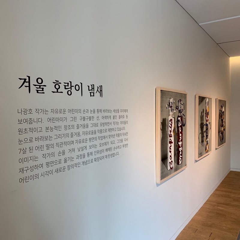 분명 어디서 본 것 같은데, 아무래도 조금 다른 것도 같아 작품 제목과 작가를 확인해 보게 되는 약간의 혼란을 겪게 됩니다. 이는 나광호 작가가 대가의 명작을 모방한 어린 학생들의 그림을 캔버스에 옮겨 완성한 까닭입니다. 같은 제목의 다른 작품들이 여럿 존재하는 이유기도 하지요. 명작의 아우라와 아이들의 직관적인 드로잉, 그리고 예술이 지닌 무게감은 털어내고 예술 본래의 즐거움을 찾아내려는 작가의 노력이 하나가 되어 탄생시킨 작품들은 친숙하면서도 낯설고, 진지하면서도 흥겨운 독특한 매력을 지니고 있습니다. 잊고 있던 예술의 놀이적 성격을 일깨우기에, 부담 없이 따라 그려보고 싶은 생각이 들기도 합니다. 작품을 대하는 마음은 가볍게 해주지만 전문가의 섬세한 손길로 완성되어 작품 고유의 멋이 생생히 담긴 그림으로 한 걸음 더 가까이 예술을 느껴 보시기 바랍니다.