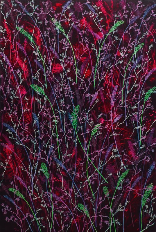 빠른 필치로 그려진 김호준 작가의 작품을 바라보면 시원한 속도감이 느껴집니다. 작가는 물, 풀, 숲 등 자연 친화적인 소재를 여러 겹 중첩하여 독특한 드로잉적 화면을 구성합니다. 자신에게 시각적 여운과 울림을 주는 대상을 선정하여 화면을 구성하였다는 작가는, 개별적인 존재보다 전체로서의 풍경에 집중하고 있습니다. 작품 전면에 보이는 다양한 모습의 사물의 다양한 모습에서 비롯된 영겁의 시간을 나타냅니다. 작품을 말없이 바라보고 있노라면 느껴지는 깊은 여운은 대상에 대한 깊이 있는 탐구에서 비롯된 것이 아닐까요?