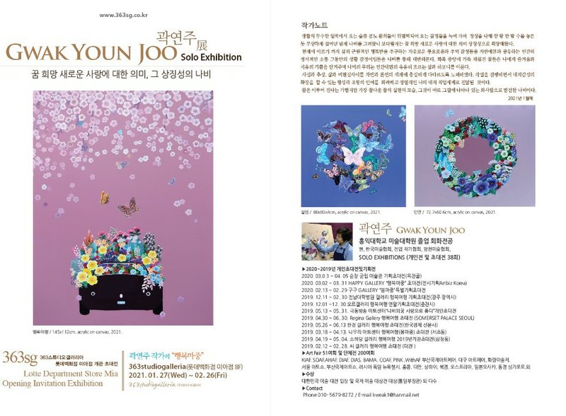 곽연주 작가는 꽃, 나비를 이용하여 희망을 그려내는 작가입니다. 작품에는 화면 가득히 섬세하고 가지런하게 꽃과 나비들이 묘사되어 있습니다. 단순한 대상의 구성을 넘어, 정돈된 화면에는 작가가 지금까지 작업해온 대상에 대한 통찰력이 엿보이기도 합니다. 작가는 자신의 그림을 통하여 사람들에게 밝은 에너지를 전달하며 일상의 활력을 선물하고 싶어합니다. 곽연주 작가의 활력과 기분이 작품을 통해 전해졌기 때문일까요? 작품을 보고 있으면 하루하루 반복되는 일상에 무언가 좋은 소식이 찾아올 것만 같습니다. 곽연주 작가의 작품을 통하여 고객님의 공간에 긍정적인 희망의 에너지를 더해보시는 것은 어떨까요?