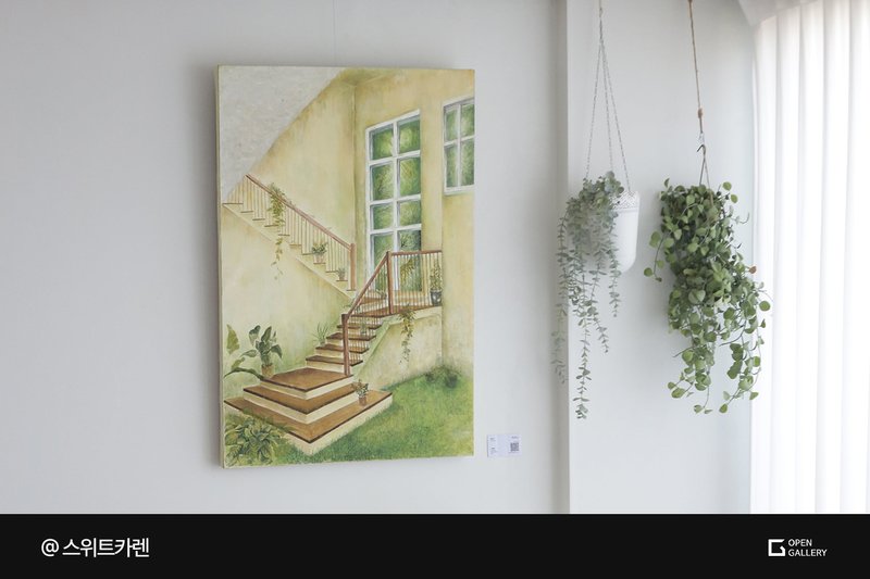 비현실적이고 몽환적인 자연 풍경과 현대 건축물이 뒤엉켜 나타내는 모습은 왠지 모르게 마음에 평안과 휴식을 느끼게 해줍니다. 자연이라는 주제는 단순한 아름다움이 아닌 현대인들의 자유 의지를 상징합니다. 풀이 자라고 생명이 자라는 자연에서 여유를 찾고 위로받는듯한 기분이 듭니다. 우리가 떠나는 여행도 보통 살아있는 자연으로부터 기운을 얻기 위함이죠. 복잡한 감정의 알레고리를 풀어 어지럽게 뒤엉킨 생각에서 벗어나고 싶을 땐 어떻게 해야 할까요? 김지니 작가는 다양한 사회적 관계에서 오는 스트레스에서 벗어나 안식을 찾을 수 있도록 인간이 편안함을 느낄 수 있는 싱그러운 초록색을 사용하였습니다. 자연이 현실 공간으로 스며들어 파릇한 기운 그대로 연상되며 편안한 안식처처럼 말입니다. 지친 현대인들을 위한 공간이라는 설정이 마음에 전달되었으면 좋겠습니다. 고단한 삶에 지쳐 잠시 잊고 살았던 솔직한 내 모습을, 자연과 함께 융화되어 찾아보는 건 어떨까요?
