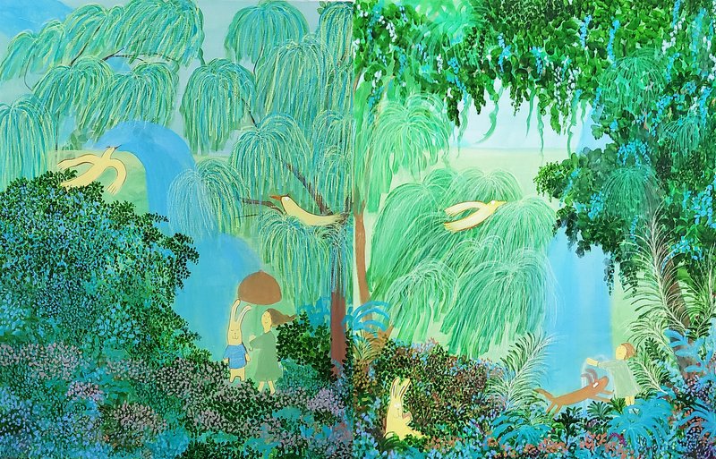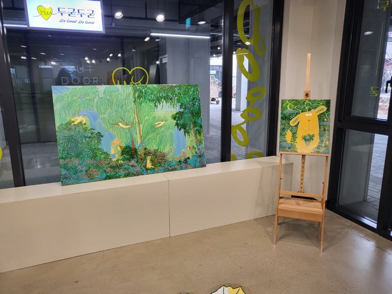 대자연 속에는 늘 좋은 기운이 가득하다. 나무의 싱그러움 그 사이로 지나가는 바람의 숨결, 아낌없이 따스한 기운을 주는 따뜻한 햇볕. 빌딩 숲에서 살아가는 현대인들에게 자연은 그리움의 대상인 동시에 도피하고 싶은 낙원의 의미가 있다. 빠르게 하루를 보내는 동안 하늘 한번 쳐다볼 시간조차 없는 이들에게 여유와 휴식이 필요한 이유다.단순한 형태의 익살스러운 동물들이 자연 속에서 뛰노는 모습은 감상자에게 편안함을 느끼게 해준다. 어려운 의미나 속내를 파악하려 애써 노력하지 않아도 되는 작가의 의도대로 그저 즐기기만 하면 좋을 것이다. 대자연의 싱그러움 속에서 본인이 좋아하는 것들과 함께 뛰노는 상상 속 동물들을 보며 행복과 여유를 찾아보는 건 어떨까.