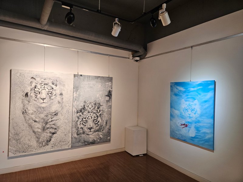 화사한 캔버스 속 발랄한 동물들이 눈길을 사로잡습니다. 해맑은 표정과는 대비되는 거대한 몸집은 어딘가 웃음을 자아냅니다. 의인화된 동물들이 말하고자 하는 건 무엇일까요? 반려동물 두 마리와 함께 사는 김시연 작가는 생활 속 다양한 에피소드와 반려동물에 대한 사회적, 윤리적 문제에 대해 본인만의 시선으로 재미있게 풀어내고자 합니다. 상상하는 공간 안에 작가 본인을 투영시킴으로써 즐겁고 행복한 작업을 이어가고 있다는 김시연 작가는 상징적 이미지를 통해 주제를 부각하고자 합니다. 노마디즘(사유의 여행), 자아를 향한 탐구 등을 주제로 반려동물과 본인을 결합하여 의인화된 캐릭터들은 보는 이로 하여금 행복한 심상을 갖게 해줍니다. 귀여운 반려동물을 보며 어쩌면 놓치고 있었던 새로운 시각을 경험해 보시길 바랍니다.