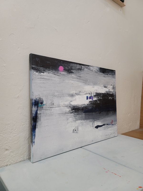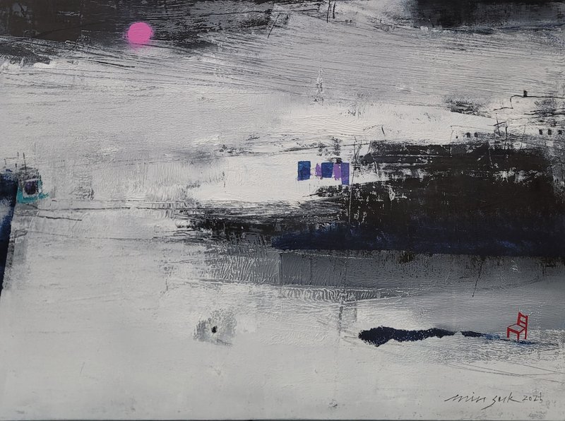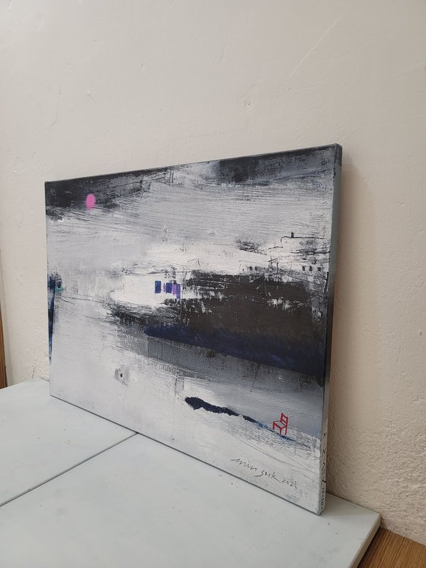 풍경화인 것 같으면서도 마치 추상화인 것 같기도 한 작가의 그림은 우리의 시선을 사로잡습니다. 아름다운 색의 향연은 우리의 마음에 깊은 여운을 남기고 그림 앞에 오래 머무르게 합니다. 풍경 속 하늘이 매우 인상적인 느낌을 줍니다. 구름 사이로 존재감을 드러내는 한 줄기의 빛 같기도 하고 봉우리를 수줍게 드러낸 산의 형상 같기도 합니다. 아마 보는 이의 마음과 기분에 따라 달리 보일 수 있겠지요. 실재를 그대로 재현하지 않았기에 우리에게는 그림을 해석할 수 있는 여지가 생기고 심상의 한계를 더욱 넓혀갈 수 있습니다. 고요하고 묵직한 울림을 주는 듯한 풍경 속에서 아름답게 빛나고 있는 색의 향연 속에 빠져들어 보세요.