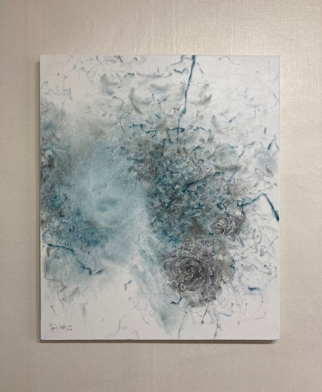 마치 먼지를 쓸어내는 깃털처럼, 박길우 작가의 작품에는 세상의 악함을 털어내는 깃털이 등장합니다. 깃털들은 오스카 와일드의 소설 ‘나이팅게일과 장미’에서 자신의 몸을 바쳐 핏빛 장미를 선사한 나이팅게일의 순수한 감정에 대한 찬사의 의미를 가집니다. 회색빛 나뭇가지들과 깃털들 사이에 순수한 영혼을 상징하는 푸른빛과 사랑을 뜻하는 붉은 장미를 소중히 담아냅니다. 박길우 작가의 부드럽고 간질간질한 붓 터치를 통해 세상의 먼지를 털어버리고, 가족, 우정, 사랑과 같은 소중한 감정들을 다시 되찾게 될 것입니다.
