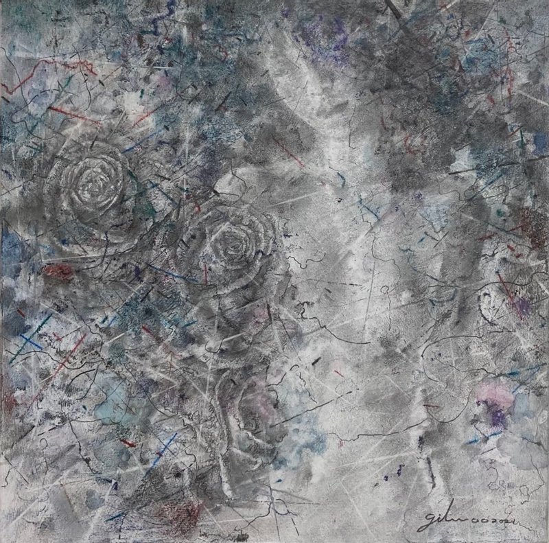 마치 먼지를 쓸어내는 깃털처럼, 박길우 작가의 작품에는 세상의 악함을 털어내는 깃털이 등장합니다. 깃털들은 오스카 와일드의 소설 ‘나이팅게일과 장미’에서 자신의 몸을 바쳐 핏빛 장미를 선사한 나이팅게일의 순수한 감정에 대한 찬사의 의미를 가집니다. 회색빛 나뭇가지들과 깃털들 사이에 순수한 영혼을 상징하는 푸른빛과 사랑을 뜻하는 붉은 장미를 소중히 담아냅니다. 박길우 작가의 부드럽고 간질간질한 붓 터치를 통해 세상의 먼지를 털어버리고, 가족, 우정, 사랑과 같은 소중한 감정들을 다시 되찾게 될 것입니다.