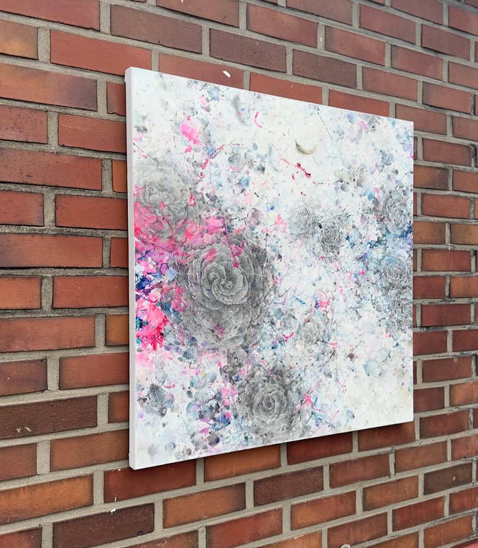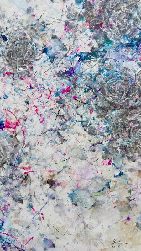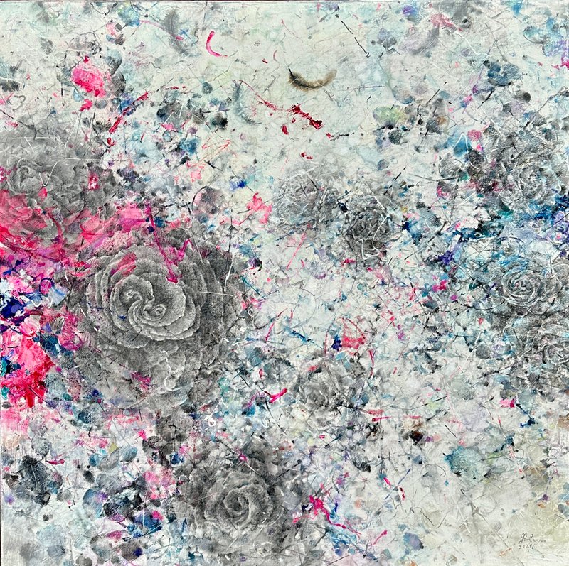 마치 먼지를 쓸어내는 깃털처럼, 박길우 작가의 작품에는 세상의 악함을 털어내는 깃털이 등장합니다. 깃털들은 오스카 와일드의 소설 ‘나이팅게일과 장미’에서 자신의 몸을 바쳐 핏빛 장미를 선사한 나이팅게일의 순수한 감정에 대한 찬사의 의미를 가집니다. 회색빛 나뭇가지들과 깃털들 사이에 순수한 영혼을 상징하는 푸른빛과 사랑을 뜻하는 붉은 장미를 소중히 담아냅니다. 박길우 작가의 부드럽고 간질간질한 붓 터치를 통해 세상의 먼지를 털어버리고, 가족, 우정, 사랑과 같은 소중한 감정들을 다시 되찾게 될 것입니다.